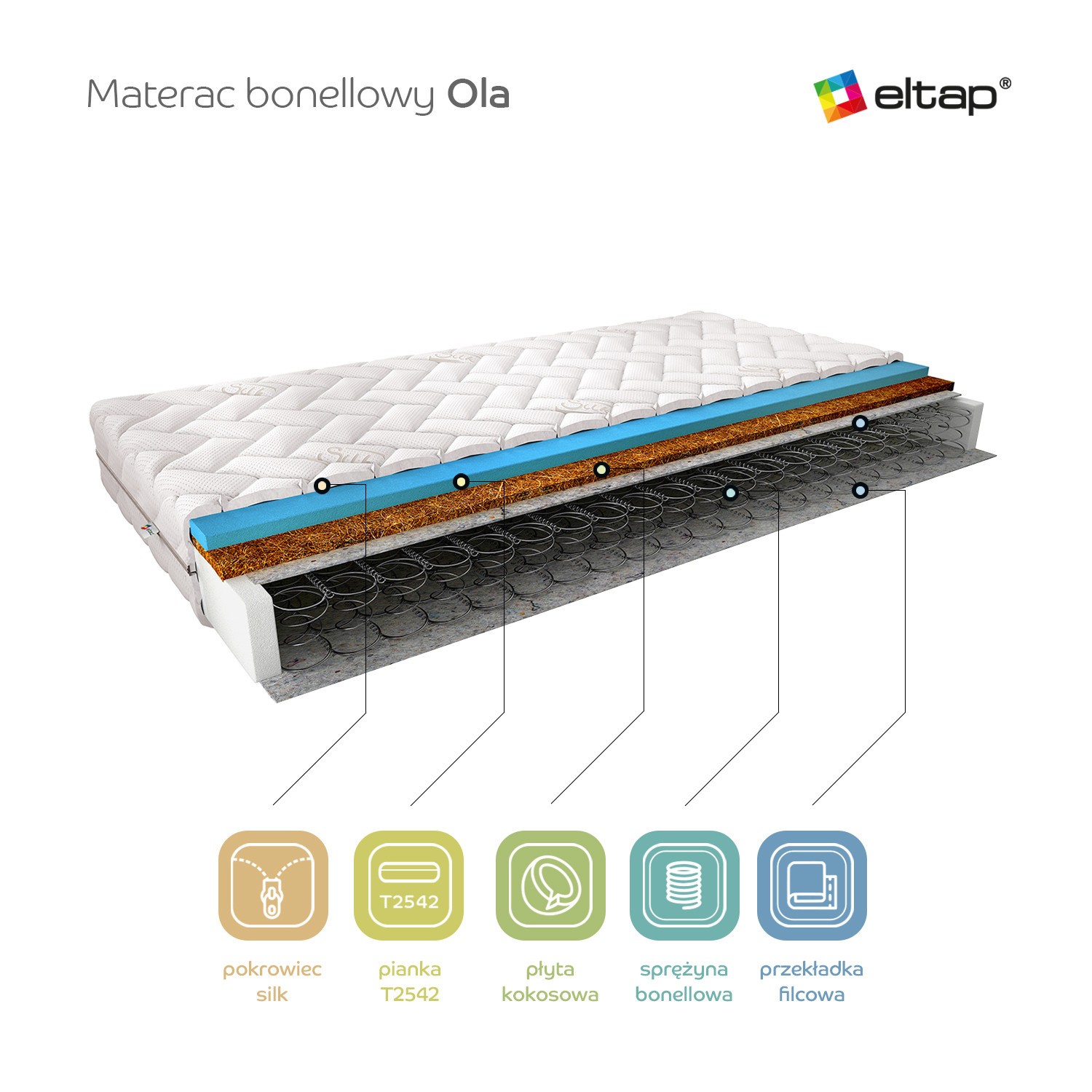 Zárukou dobrého spánku je dokonale zvolený matrac. Vieme, aký je tento výber dôležitý, a preto vám predstavujeme matrac Ola bonell v hodvábnom poťahu. Pružina Bonell zabezpečuje, že sa matrac počas používania nedeformuje, čo je mimoriadne dôležité pre pohodlie pri spánku. Pružina bonell bola pokrytá plstenou podložkou, ktorá bola navyše pokrytá kokosovou doskou a penou T2542. Všetko v elegantnom odnímateľnom hodvábnom puzdre.