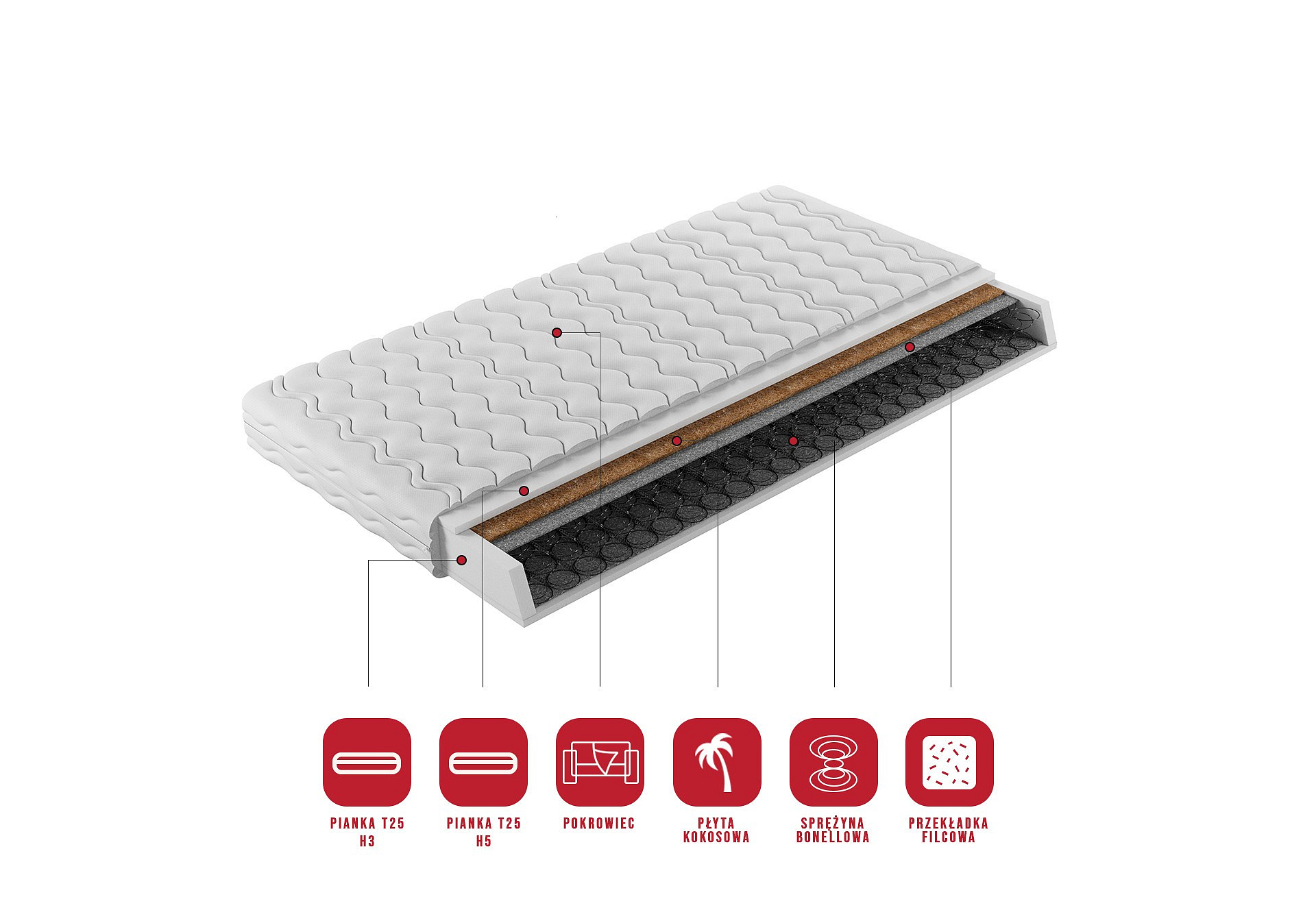 Matrac bonellový PRESTIN sa skladá z pružiny typu bonell, ktorej hlavnou výhodou je plošná pružnosť, vďaka ktorej je matrac vhodný pre každú osobu. Čo viac, výplň matraca bola vyrobená z vysoko kvalitnej polyuretánovej peny T25 s dvoma stranami tvrdosti H5 a H3 - tvrdou a stredne tvrdou. Pre zlepšenie komfortu odpočinku je model PRESTIN vybavený kokosovou doskou o výške 1 cm. Takáto kombinácia zaisťuje, že matrac má dobrú odolnosť a cirkuláciu vzduchu. Dôležitou vlastnosťou sú tiež jeho hypoalergénne vlastnosti. Antialergický, prešívaný poťah nepriťahuje prach, roztoče ani iné alergény, čo z neho robí obľúbenú voľbu pre osoby so sklonom k alergiám a podráždeniu pokožky. Navyše ho možno prať v práčke na 40 stupňov Celzia, čo ešte viac uľahčuje udržiavanie správnej hygieny spánku. Poťah má zips, vďaka čomu ho možno ľahko zložiť a nasadiť.