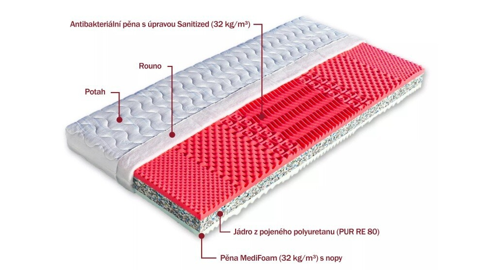 Základom matraca NEAPOL ALOE je polyuretánová pena T25 so zvýšenou pevnosťou. Mäkký povrch zabezpečuje tvarovaná 7-zónová HR pena s vysokou odolnosťou a latexom. Latex tiež výrazne zvyšuje komfort spánku tým, že podporuje chrbticu. Vďaka špeciálnym kanálikom na perforovanom povrchu zvyšujú cirkuláciu vzduchu. Špecifikácie: tvrdosť: H3 stredne tvrdá, hrúbka: 14 cm. Zloženie: povrch: obojstranný , perforovaný latex: 2 cm, tvarovaná pena N25: 2 cm, polyuretánová pena T25: 9 cm, poťah: 1 cm.