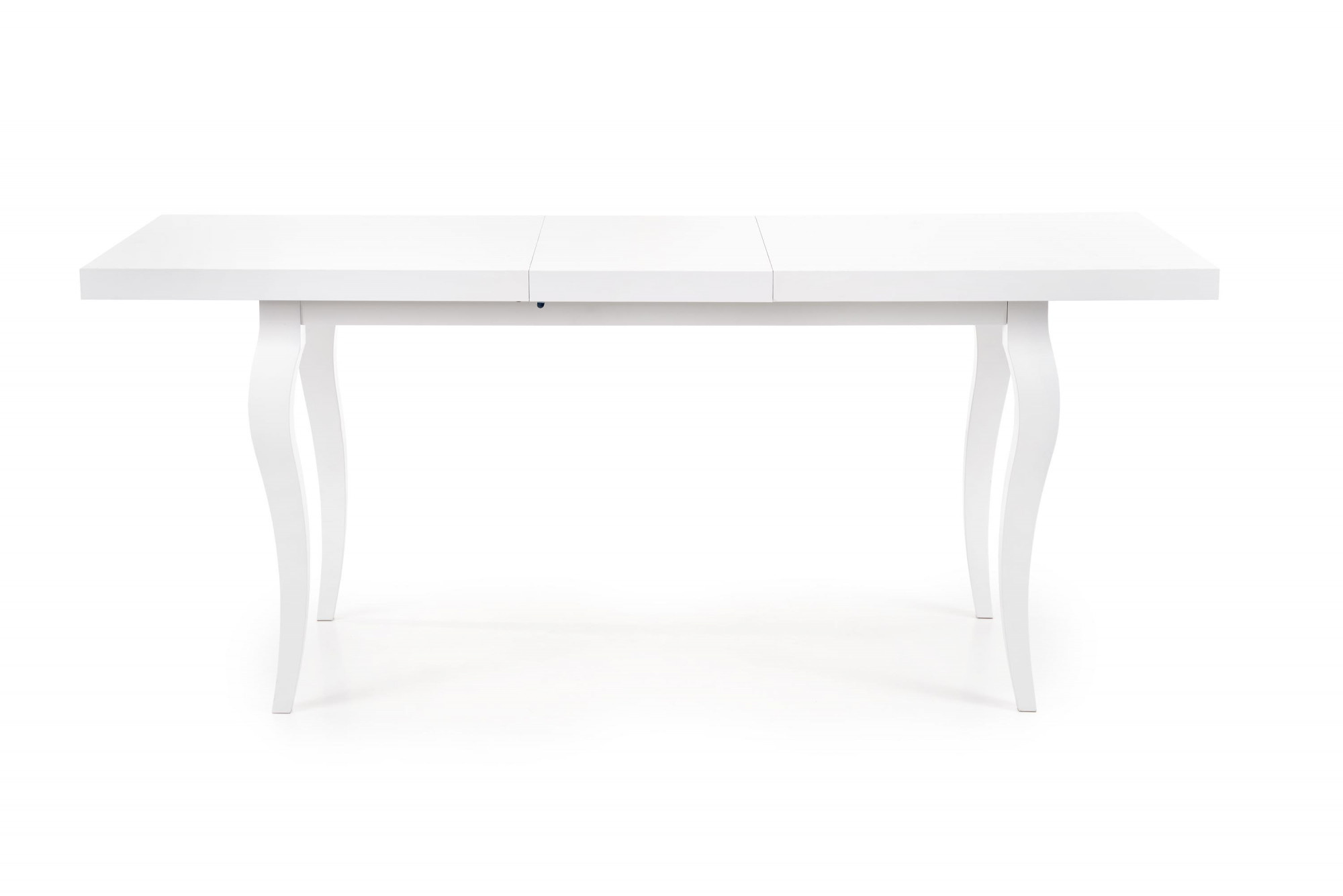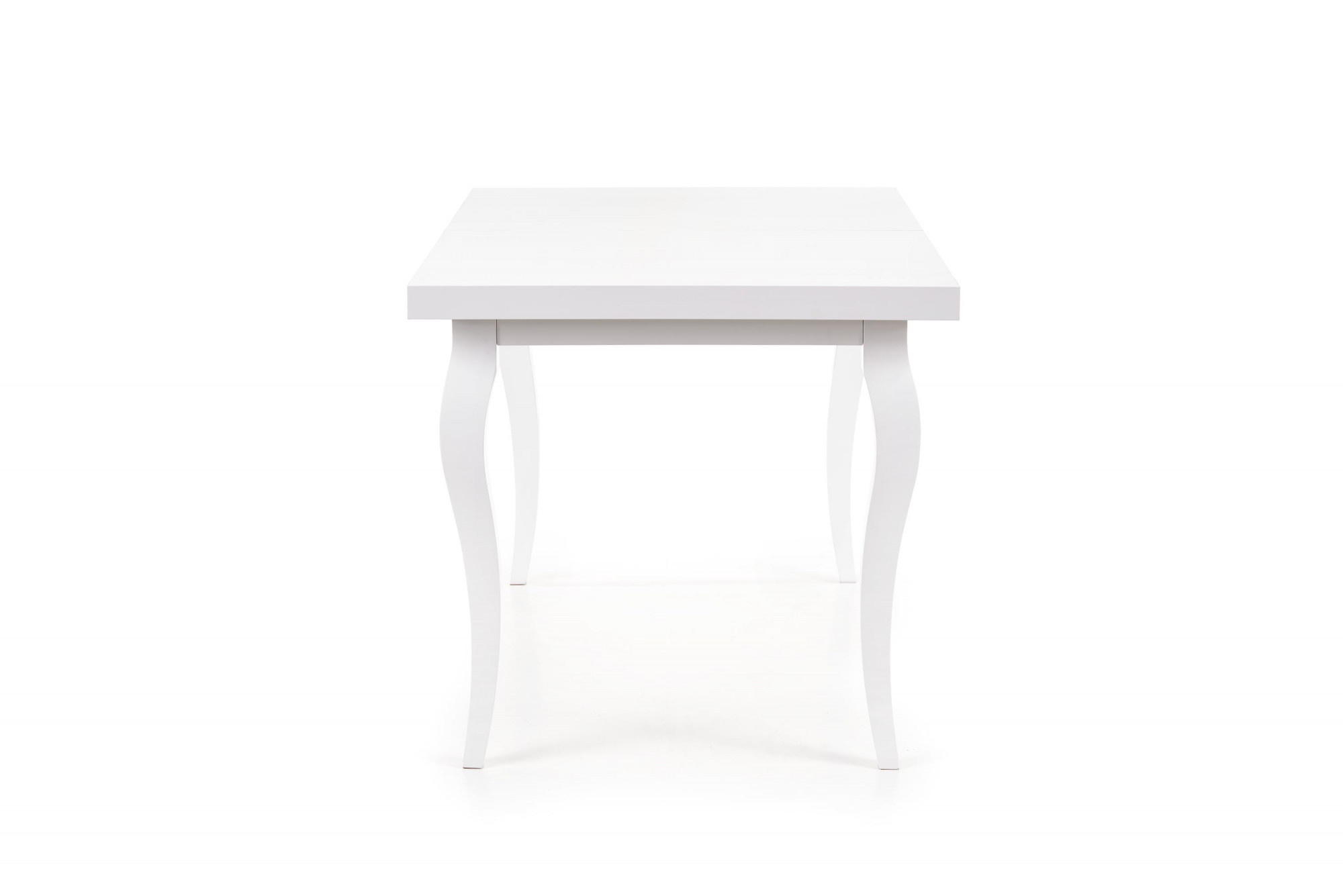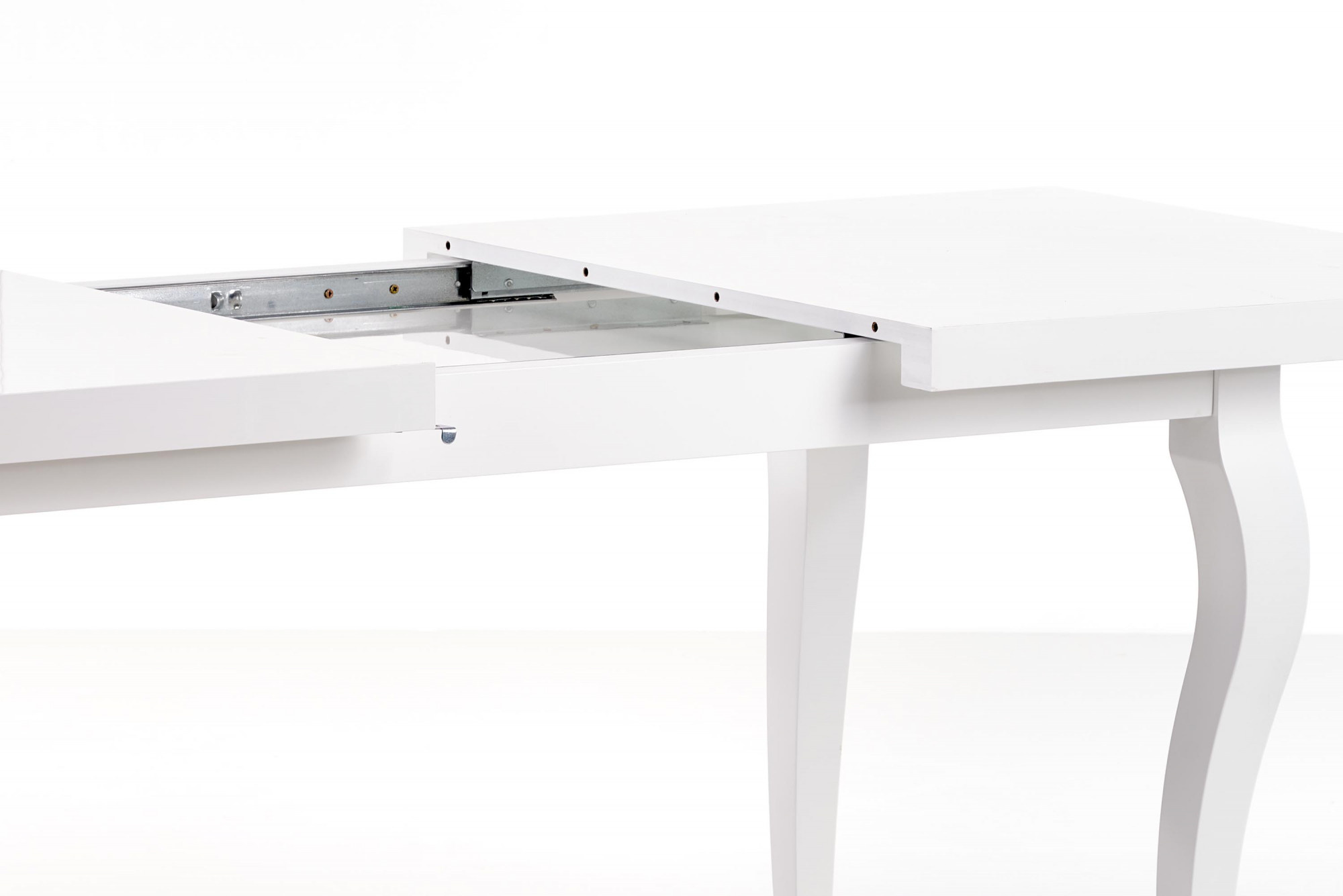 rozkladací stôl, rozmery: 140-180/80/75 cm, materiál: vrchná doska - MDF laminovaná doska + ABS hrany, nohy - masívne drevo (buk), farba: biela