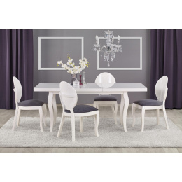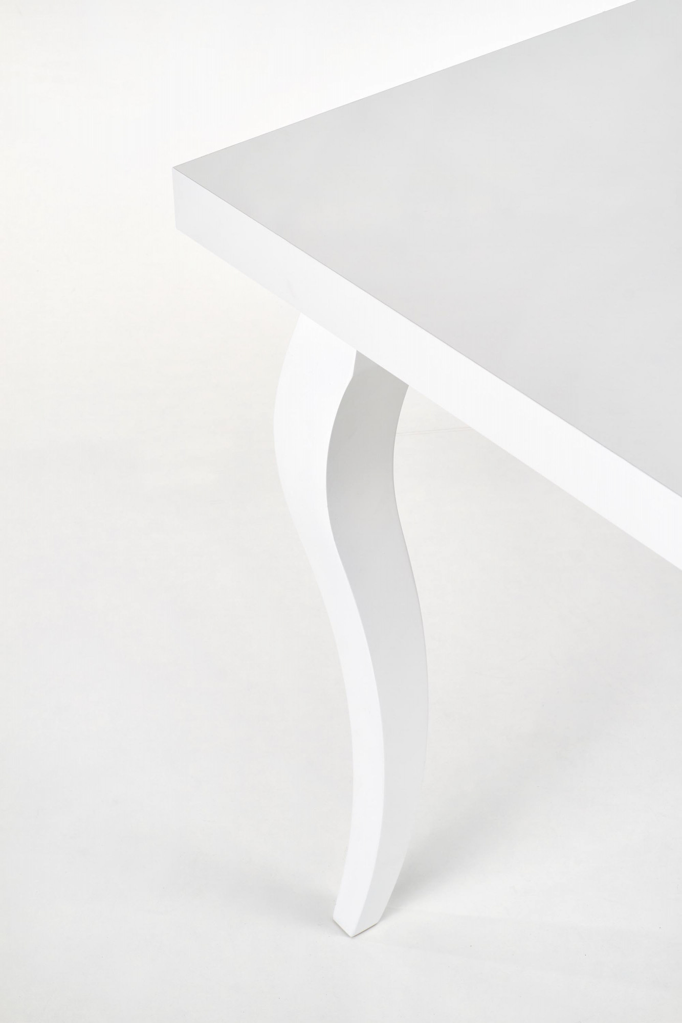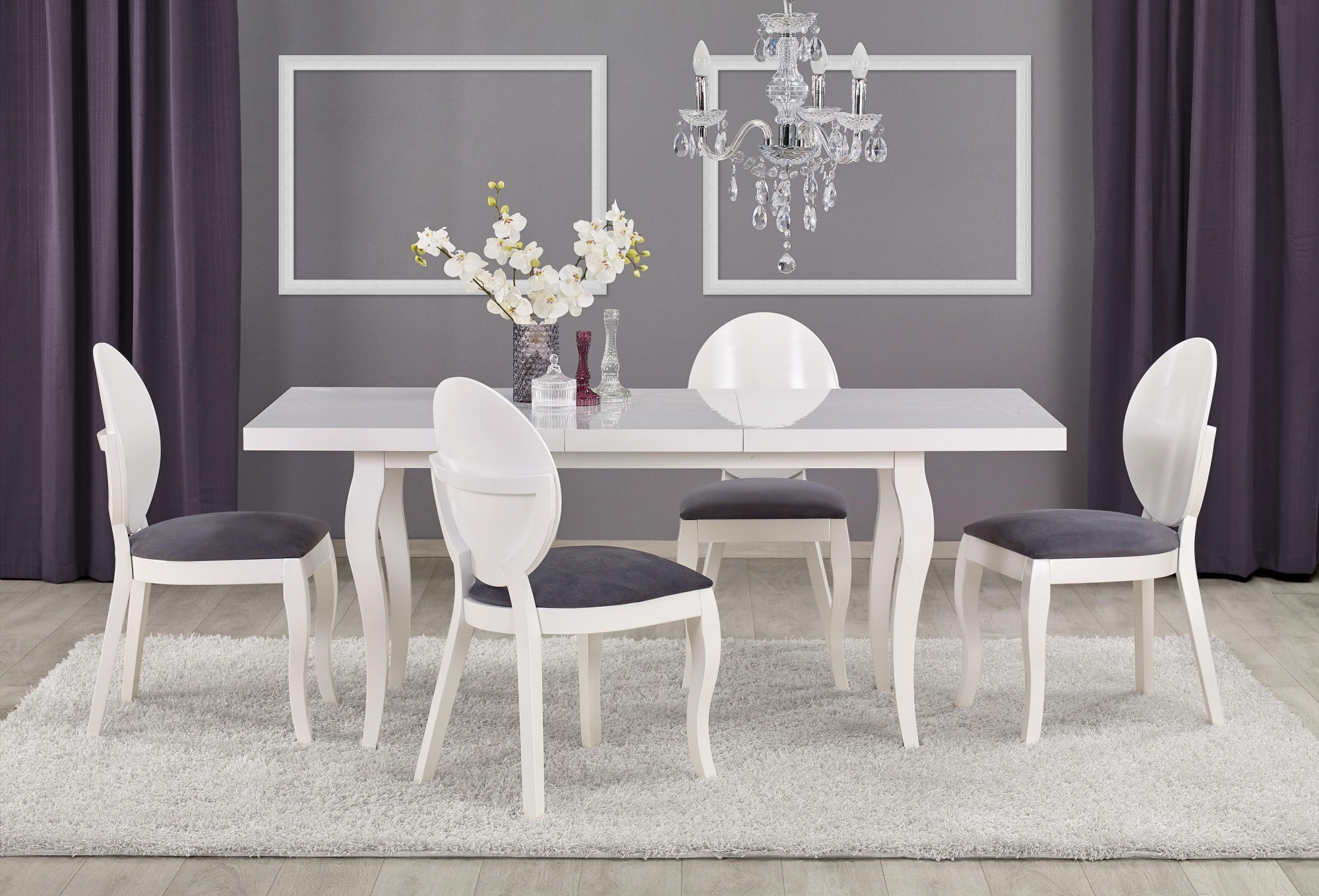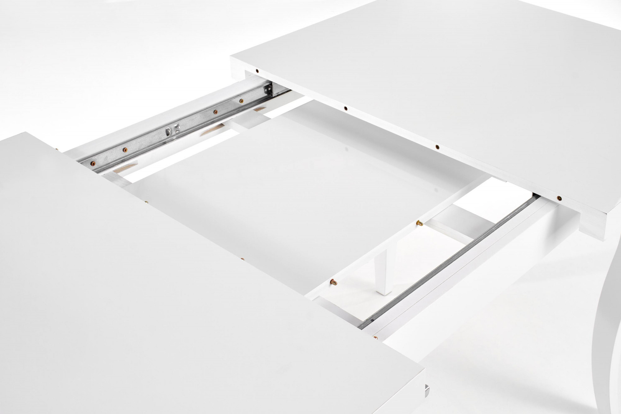 rozkladací stôl, rozmery: 140-180/80/75 cm, materiál: vrchná doska - MDF laminovaná doska + ABS hrany, nohy - masívne drevo (buk), farba: biela