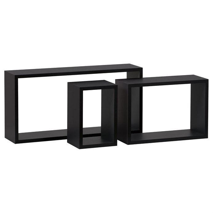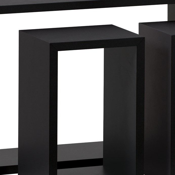Sada 3 moderných nástenných políc rôznych veľkostí v minimalistickom dizajne a obdĺžnikovom tvare. Má matnú čiernu povrchovú úpravu s jemnou štruktúrou. Rám je vyrobený z MDF, povrch matný laminát. Balenie obsahuje policu, skrutky a hmoždinky na upevnenie. Nosnosť police je 5-15 kg v závislosti od typu nosného muriva.