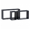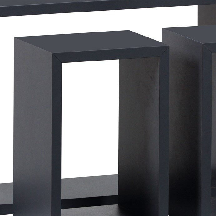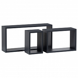 Sada 3 moderných nástenných políc rôznych veľkostí v minimalistickom dizajne a obdĺžnikovom tvare. Má tmavosivú matnú povrchovú úpravu s jemnou štruktúrou. Rám je vyrobený z MDF, povrch matný laminát. Balenie obsahuje policu, skrutky a hmoždinky na upevnenie. Nosnosť police je 5-15 kg v závislosti od typu nosného muriva.