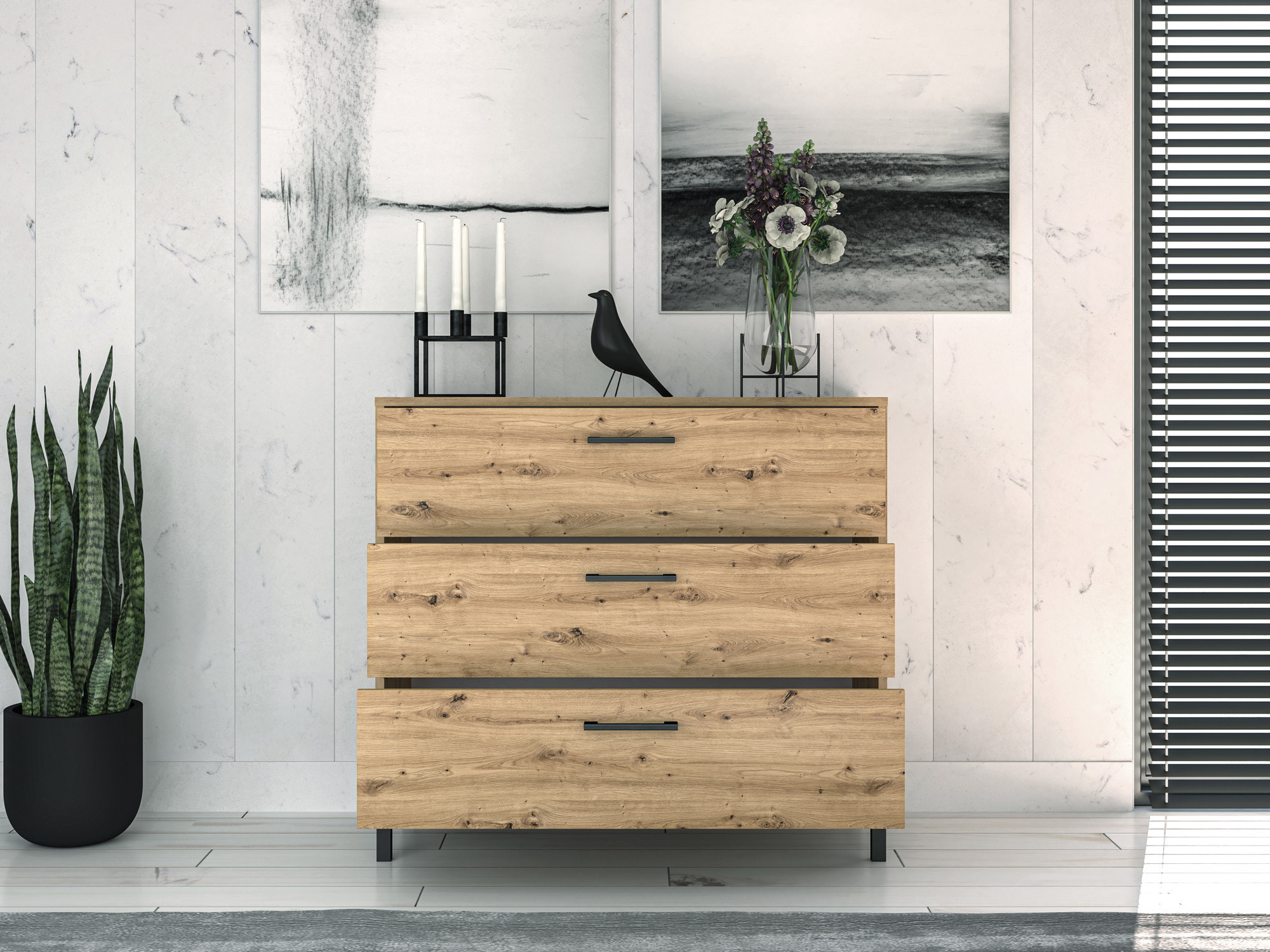 Komoda NEVIO 09 je mimoriadne praktické riešenie pre každý interiér. Krásne zrnitý dubový dekor Artisan a čierne prvky v podobe úchytiek a nôh vytvárajú nezvyčajnú kombináciu. Vďaka priestranným zásuvkám je komoda ideálnym miestom na uloženie potrebného príslušenstva. Navyše upratovanie ešte nikdy nebolo také jednoduché vďaka vysokým nohám, pod ktoré sa zmestí klasická vysávačová hubica, jazdecký robot alebo mop.
