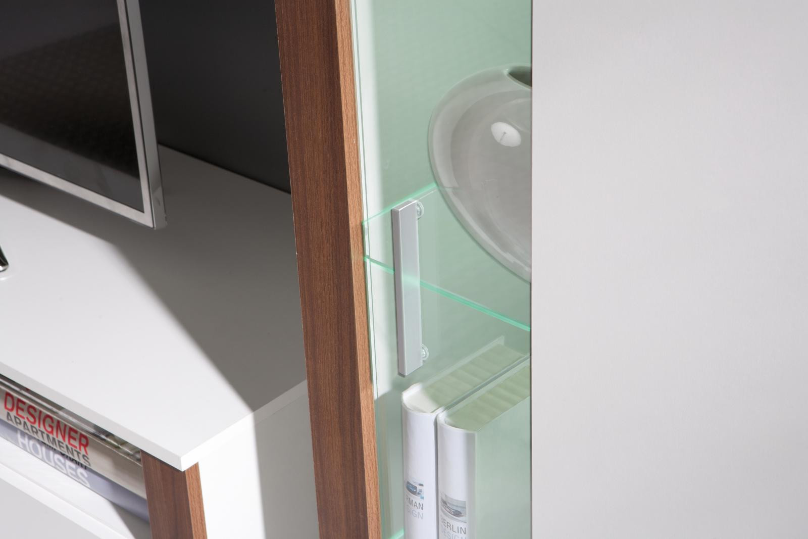Vitrína Piass bude vyzerať skvele ako doplnok interiérovej steny Piass, ale aj ako solitér. Je vyrobená z laminátu s hrúbkou 16 mm v prevedení biela/orech, ktorý je odolný voči poškriabaniu, poškodeniu, vlhkosti a vysokým teplotám. Vitrína sa dodáva v demontovanom stave a obsahuje montážny plán vrátane všetkých potrebných spojovacích prvkov. Vitrínu je možné objednať v troch dekoroch, ľavom a pravom, a môže byť osvetlená svetlami LED - osvetlenienie je zahrnuté v cene, je potrebné ho zakúpiť samostatne. pre inšpiráciu je priložená fotografia zostavy, ktorá sa skladá z častí systému Piass. Túto súpravu nájdete aj v našej ponuke. Zobrazené dekorácie nie sú zahrnuté v cene.