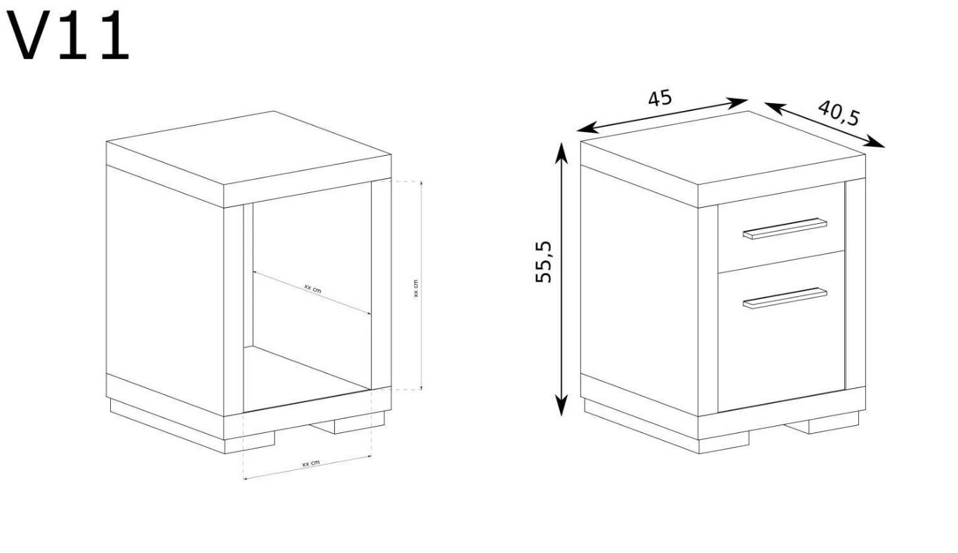 Jednoduchý nočný stolík z kolekcie Vegas. Má jednu zásuvku a skrinku pod ňou s voľným priestorom. Skrinka je ideálna na umiestnenie v spálni vedľa postele. Môžete si naň položiť budík, pohár vody a mať po ruke základné veci a príslušenstvo. Kovové úchyty zvyšujú pevnosť nábytku. K dispozícii v štyroch farbách.