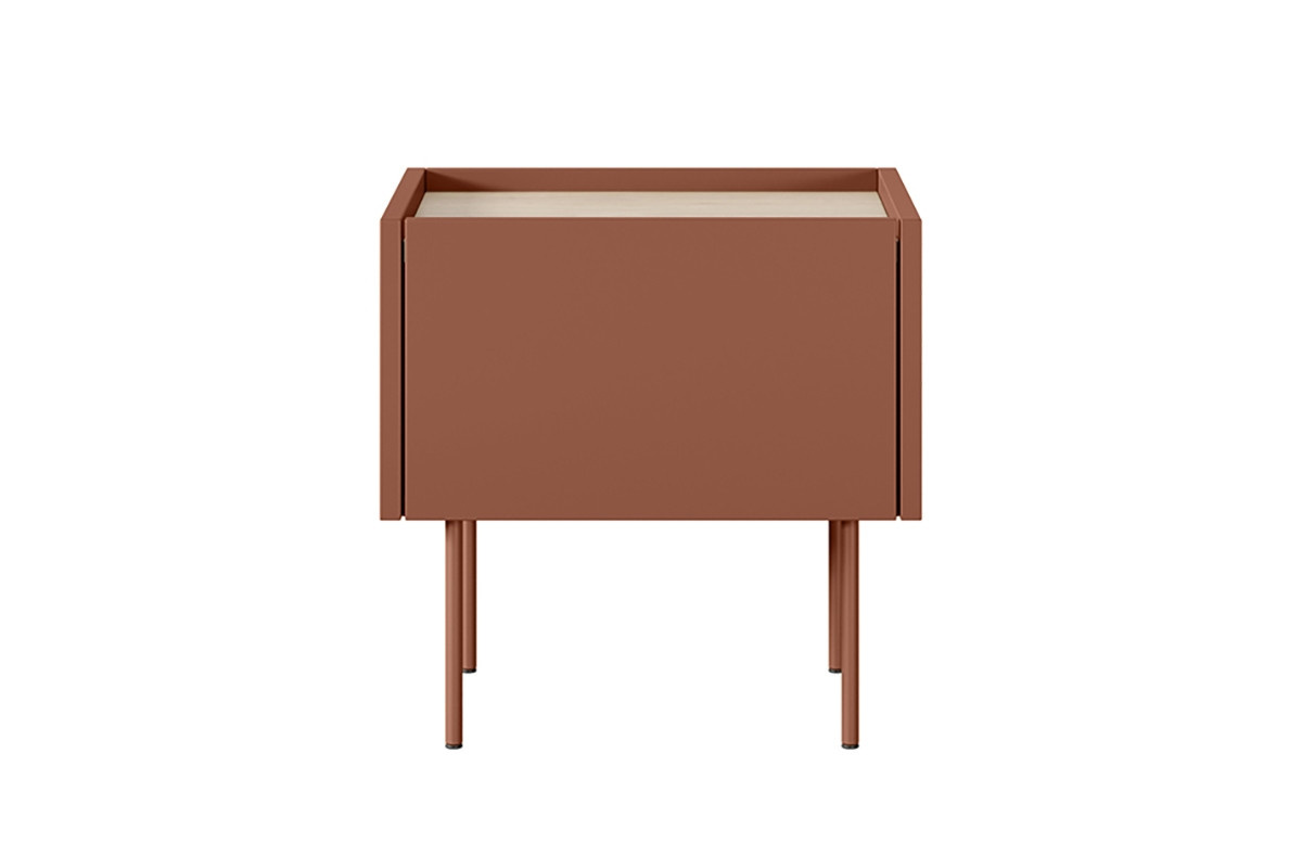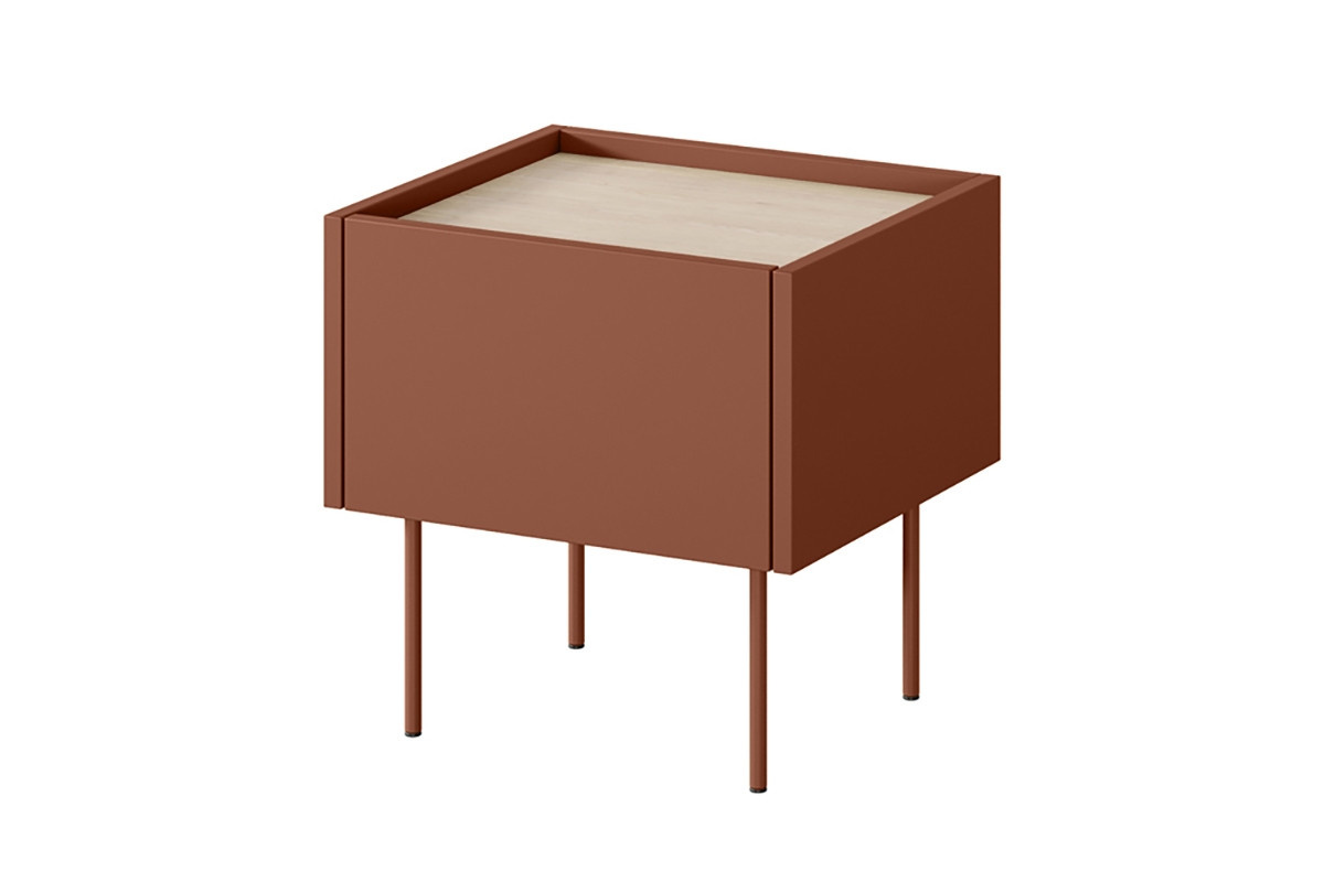 Nočný stolík so zásuvkou Desin 45 1SZ - keramická červená / dub nagano, šírka: 45, výška: 45, hĺbka: 40, montáž: vlastná. Truhlica RTV na čiernych kovových nohách.