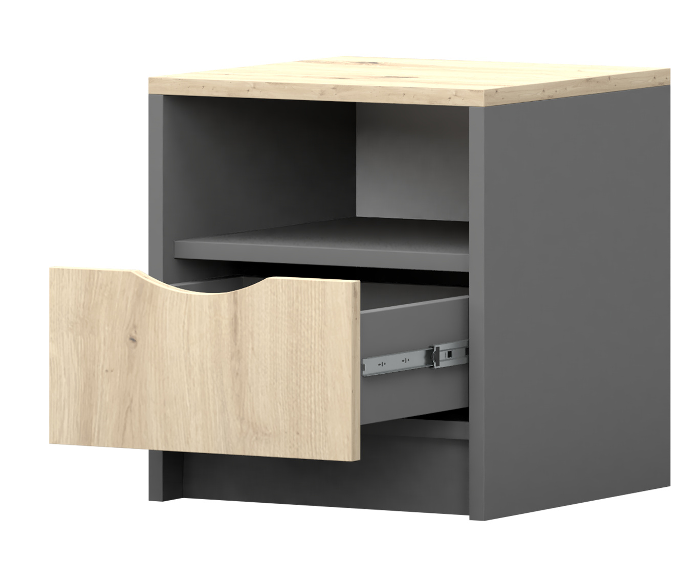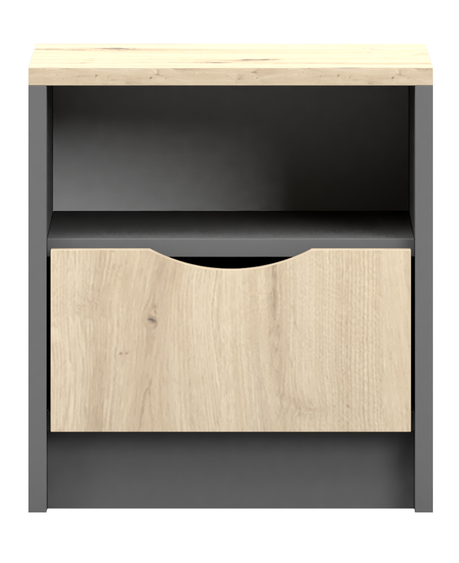 Kombinácia šedej farby a dekoru Dub Artisan dodáva stolíku moderný a pritom prírodný vzhľad, ktorý sa ľahko zladí s rôznymi štýlmi interiéru. Či už preferujete minimalistický, škandinávsky alebo rustikálny štýl, nočný stolík JOY II 22 sa stane harmonickým doplnkom vašej spálne.