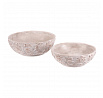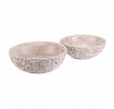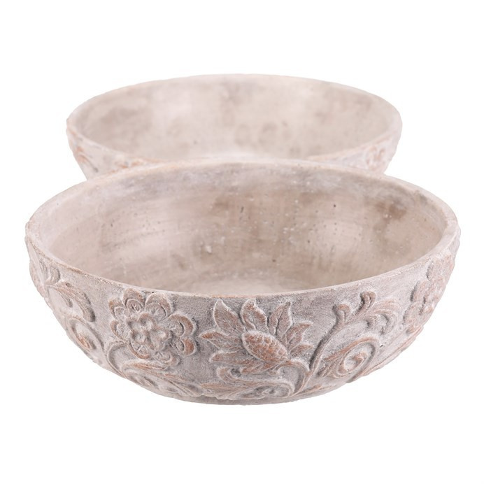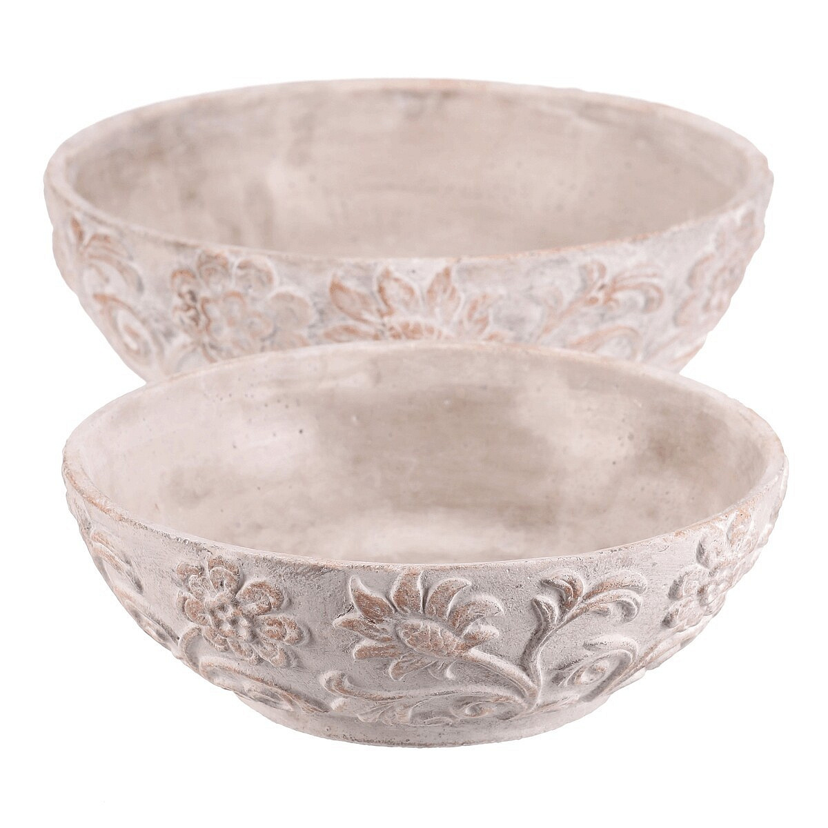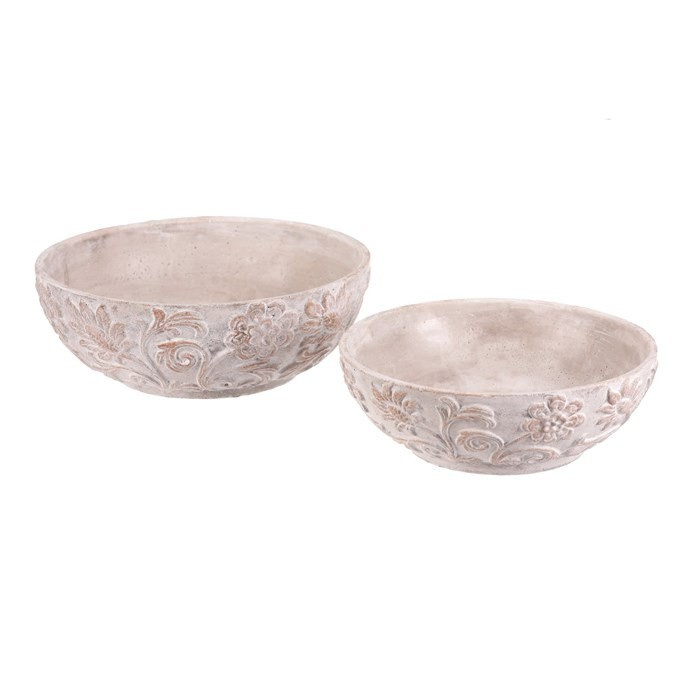 Sada dvou keramických misek v krémovém odstínu zaujme jemným květinovým dekorem po obvodu. Misky mají příjemně zaoblený tvar a matný povrch, který podtrhuje jejich přírodní vzhled. Jsou vhodné pro dekorativní použití, například jako podložka pod květináče nebo na drobné dekorace. Keramický materiál je navržen pro dlouhou životnost a snadnou údržbu. Díky univerzálním rozměrům se misky snadno kombinují s různými styly interiérů.