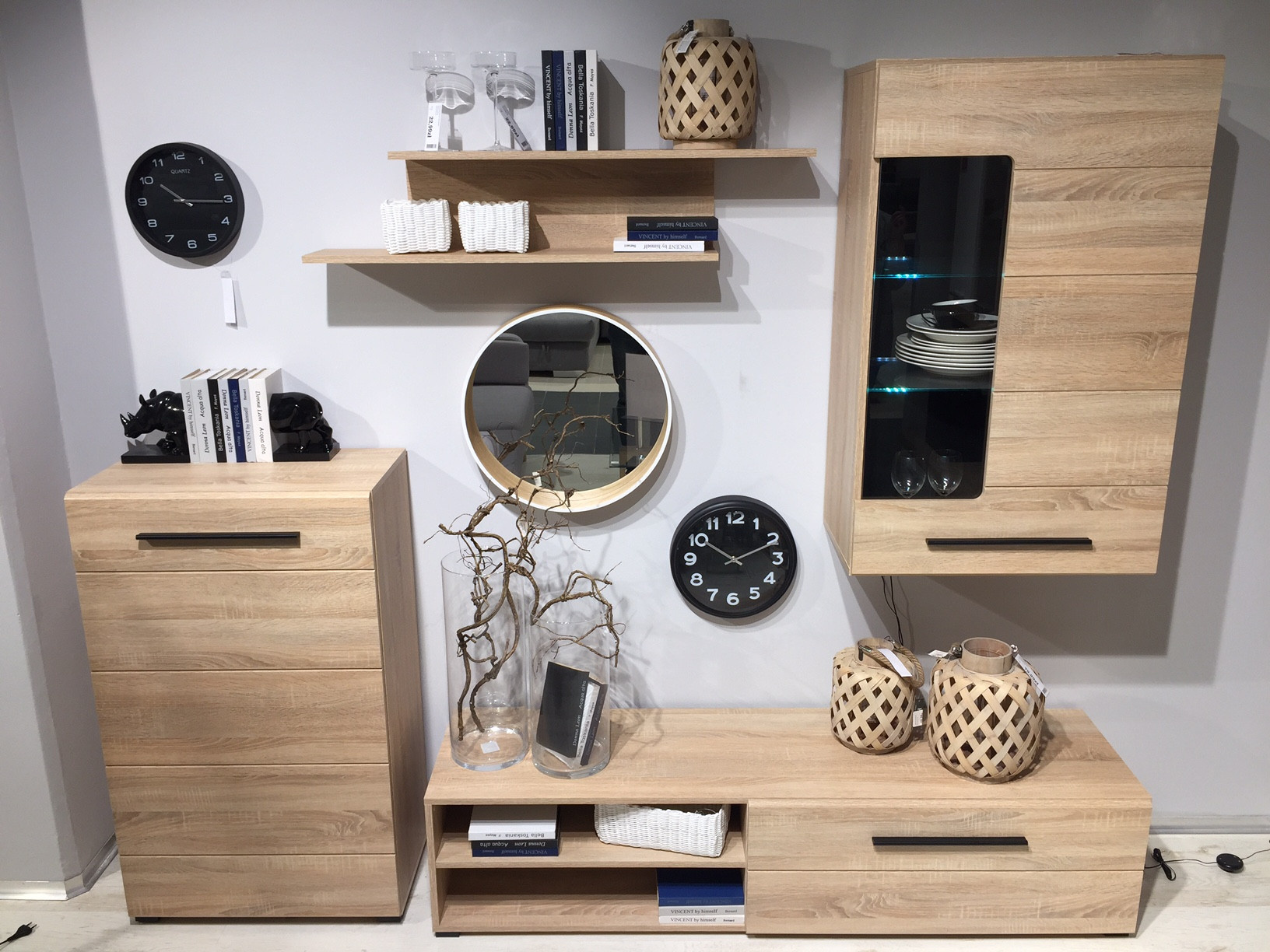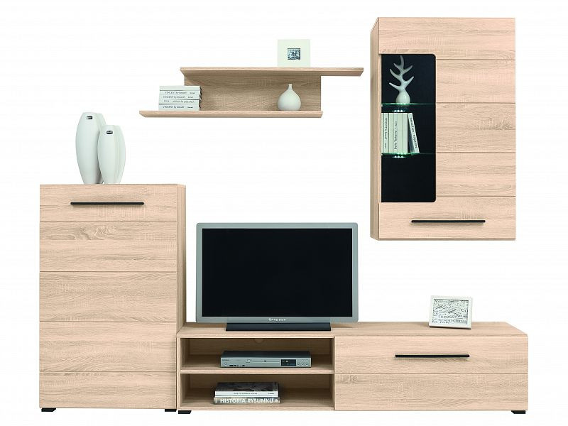 Obývacia stena Lena je vyrobená z laminátu so závesmi Hettich. Úchyty a nožičky sú plastové, sklo na dverách vitríny je tvrdené.