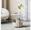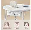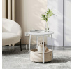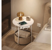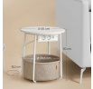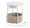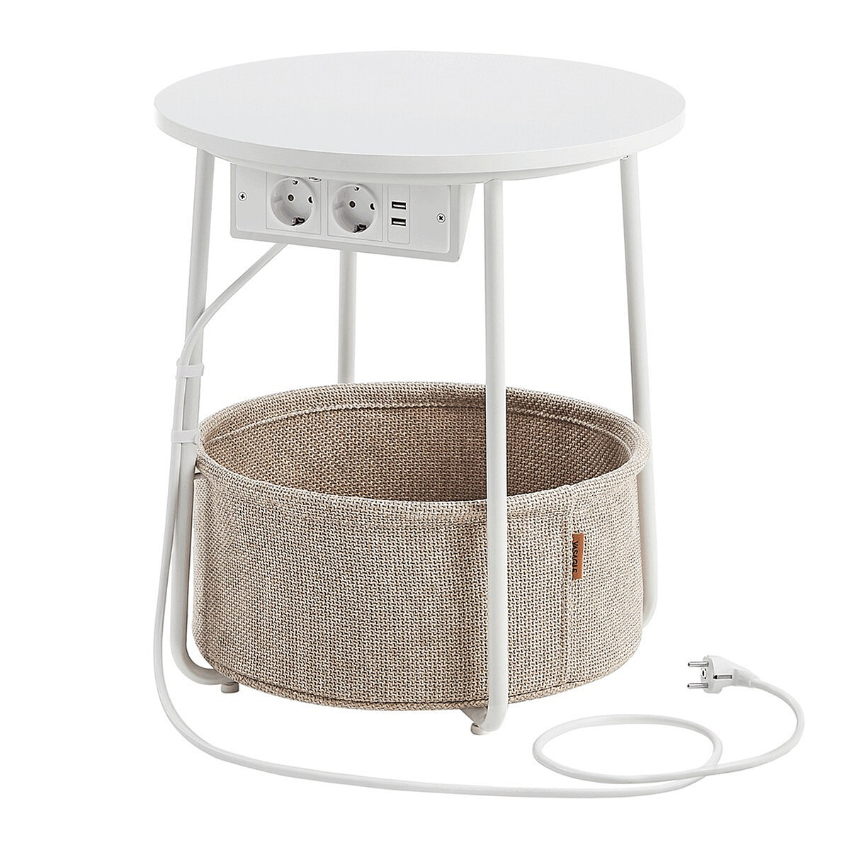 Odkládací stolek s elektrickou zásuvkou a USB porty nabízí praktické řešení pro moderní domácnosti i kanceláře. Kulatá deska o průměru 45 cm je vyrobena z MDF v bílé barvě s hladkým povrchem, který se snadno udržuje. Pevné kovové nohy v bílé barvě zajišťují stabilitu a dlouhou životnost stolku. Pod deskou je umístěn textilní koš v přírodním odstínu, který poskytuje dodatečný úložný prostor pro drobnosti. Integrovaná elektrická zásuvka se dvěma standardními výstupy a dvěma USB porty umožňuje pohodlné napájení elektroniky přímo u stolu, což zvyšuje jeho funkčnost a komfort užívání.