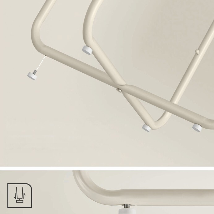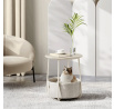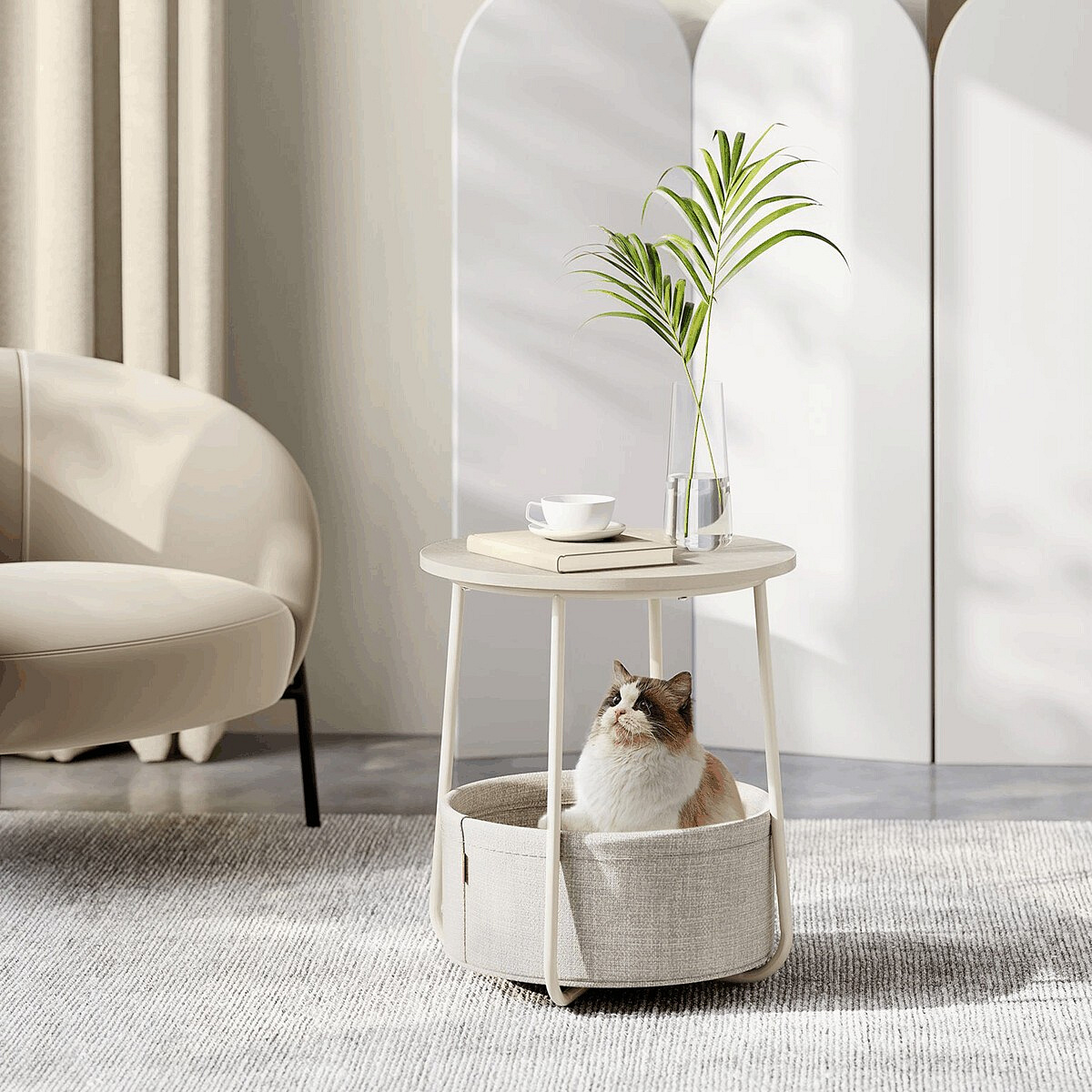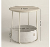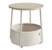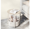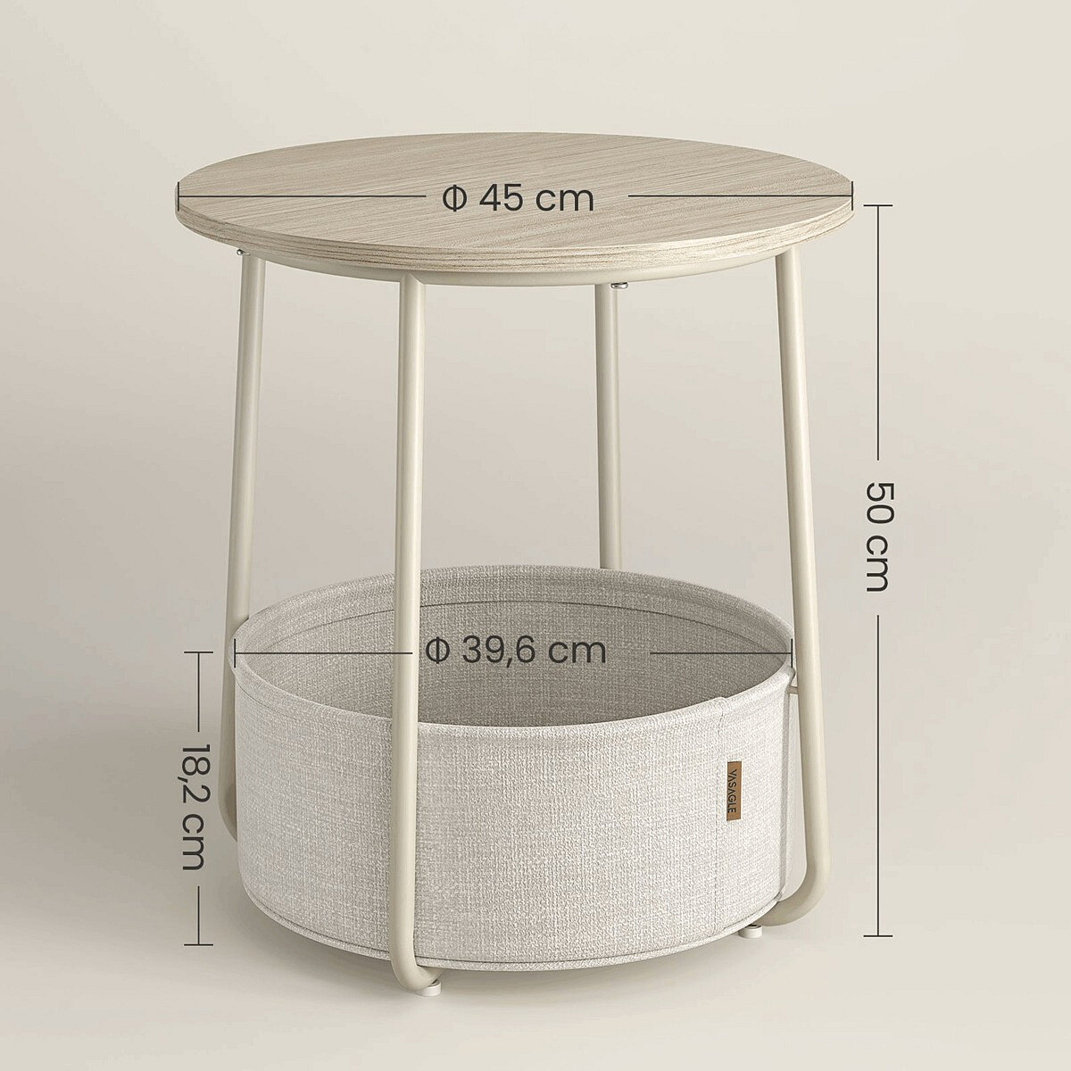Odkládací stolek s kulatou deskou o průměru 45 cm a výškou 50 cm nabízí praktický doplněk do obývacího pokoje či ložnice. Deska je vyrobena z MDF s kašmírovým dekorem v béžovém odstínu, který působí jemně a neutrálně. Pod deskou je umístěn textilní koš v krémové barvě, který poskytuje prostor pro uložení drobných předmětů a pomáhá udržet pořádek. Kovové nohy v béžovém provedení zajišťují stabilitu a pevnost stolku. Celkový design kombinuje funkčnost s nenápadným moderním stylem vhodným do různých interiérů.