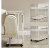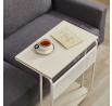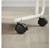 Odkládací stolek s rozměry 55 × 32 × 65,8 cm kombinuje desku a spodní polici z MDF s dekorem běleného dubu a pevnou kovovou konstrukcí v bílé barvě. Matný povrch desky usnadňuje údržbu a odolává běžnému opotřebení. Kovová konstrukce je doplněna o čtyři kolečka, která umožňují snadnou mobilitu stolku a jeho flexibilní umístění v prostoru. Praktický odkládací prostor na spodní polici nabízí další místo pro uložení drobných předmětů nebo dekorací. Kompaktní rozměry a stabilní provedení zajišťují univerzální využití v domácnostech i kancelářích.
