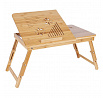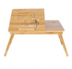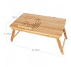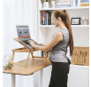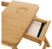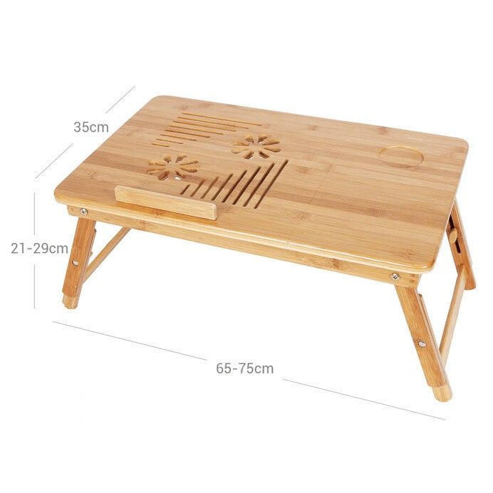 Odkládací stolek na notebook z bambusu nabízí praktické a estetické řešení pro práci i odpočinek. Deska je rozdělena na dvě části, z nichž jedna je nastavitelná do různých úhlů a opatřená větracími otvory pro lepší chlazení zařízení, doplněná o zarážku proti sklouznutí. Druhá část slouží jako pevná plocha s výřezem pro umístění šálku nebo drobných předmětů. Pevné sklápěcí nohy umožňují snadné přenášení a skladování, přičemž bambusové provedení zajišťuje stabilitu a přírodní vzhled. Stolek je ideální pro použití v posteli, na pohovce nebo na podlaze, přičemž jeho rozměry a nosnost odpovídají běžným potřebám domácího i kancelářského využití.