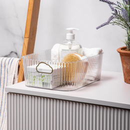 Organizér SENDA je skvelý spôsob, ako udržať každodenný poriadok. Transparentné steny s ryhovaním spôsobujú, že celok vyzerá ľahko a esteticky, a výrez v tvare obláčika mu dodáva neobvyklý charakter. Vďaka kompaktným rozmerom sa skvele hodí do kúpeľne, kuchyne, šatne alebo detskej izby.