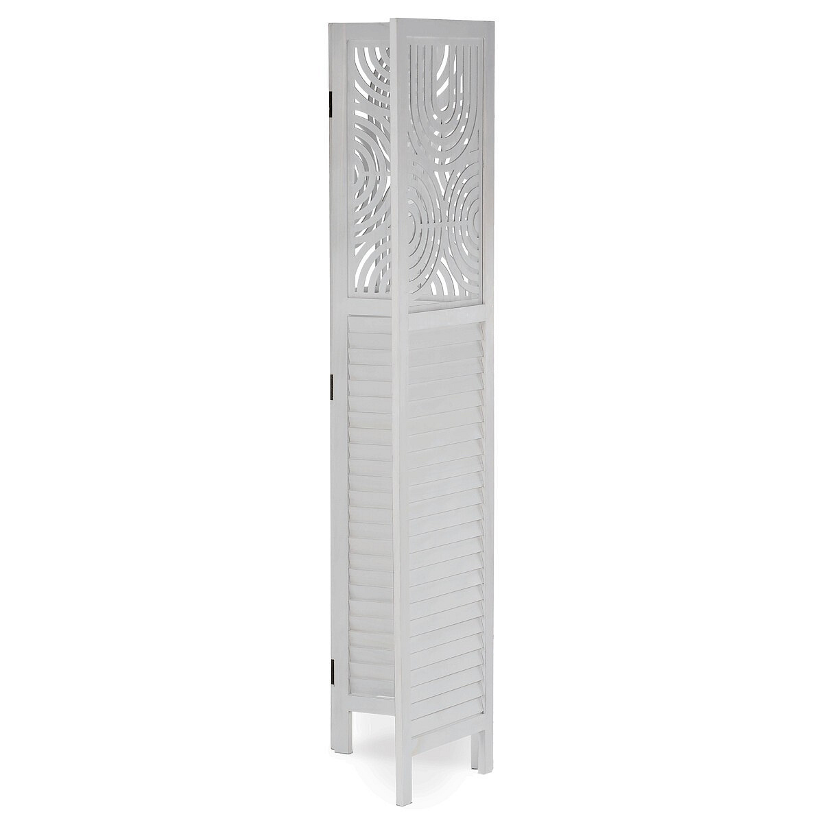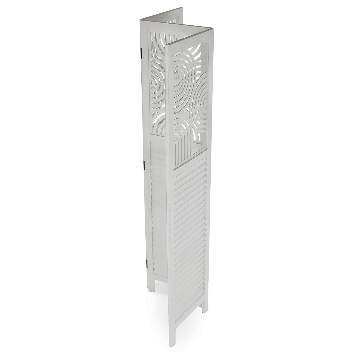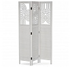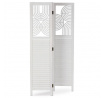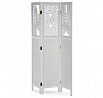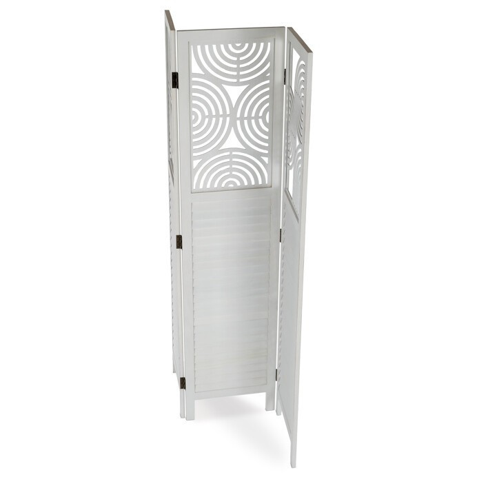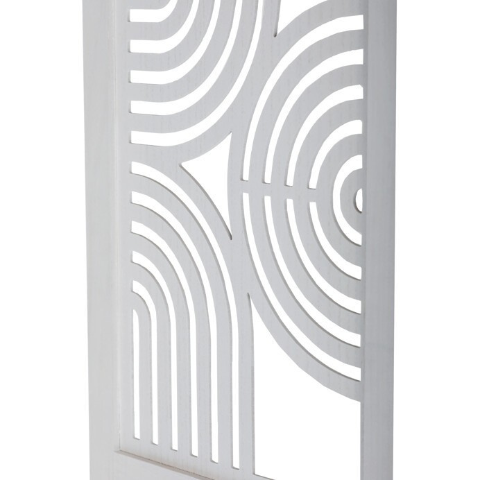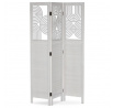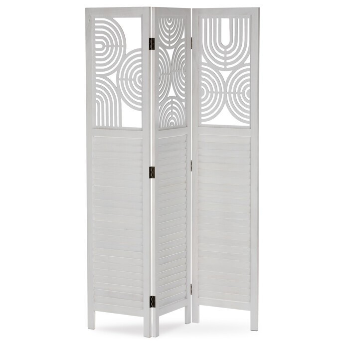 Třípanelový paraván vyrobený z masivního smrkového dřeva v bílé barvě nabízí praktické řešení pro rozdělení prostoru v interiéru. Každý díl je doplněn dekorativními výřezy v horní části, které propouštějí světlo a zároveň zachovávají soukromí. Masivní materiál zajišťuje pevnost a stabilitu, zatímco přírodní textura dřeva dodává výrobku přirozený vzhled. Paraván je vhodný pro použití v obývacích pokojích, ložnicích nebo kancelářích, kde pomáhá vytvořit útulné a funkční prostředí. Díky skládací konstrukci je snadno přemístitelný a skladovatelný.