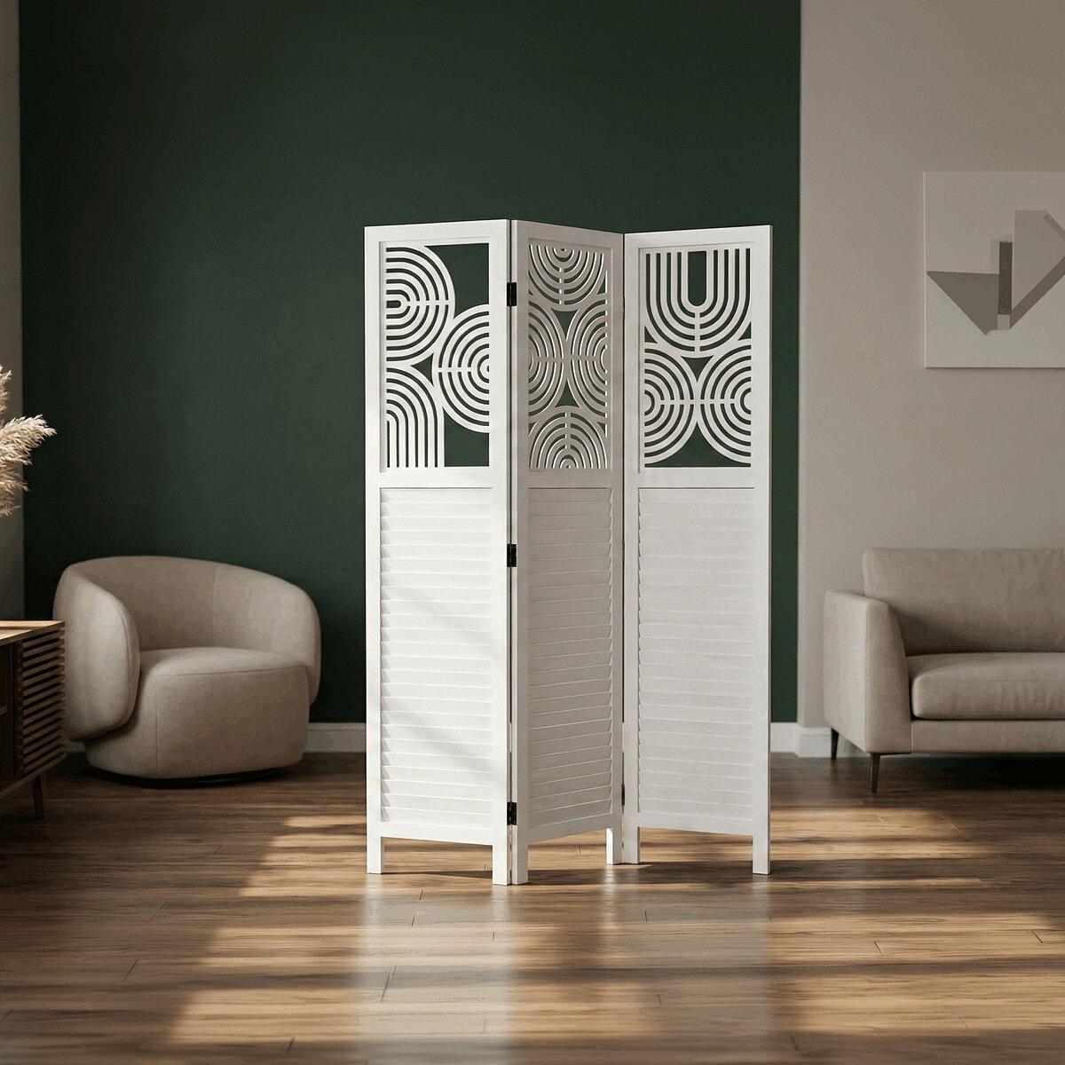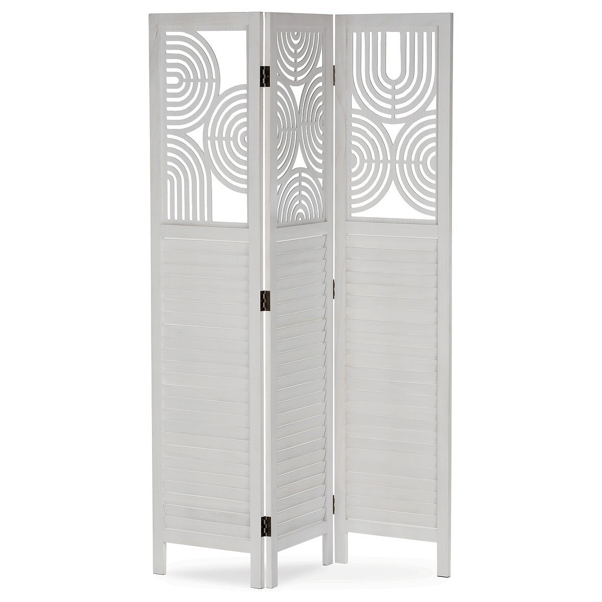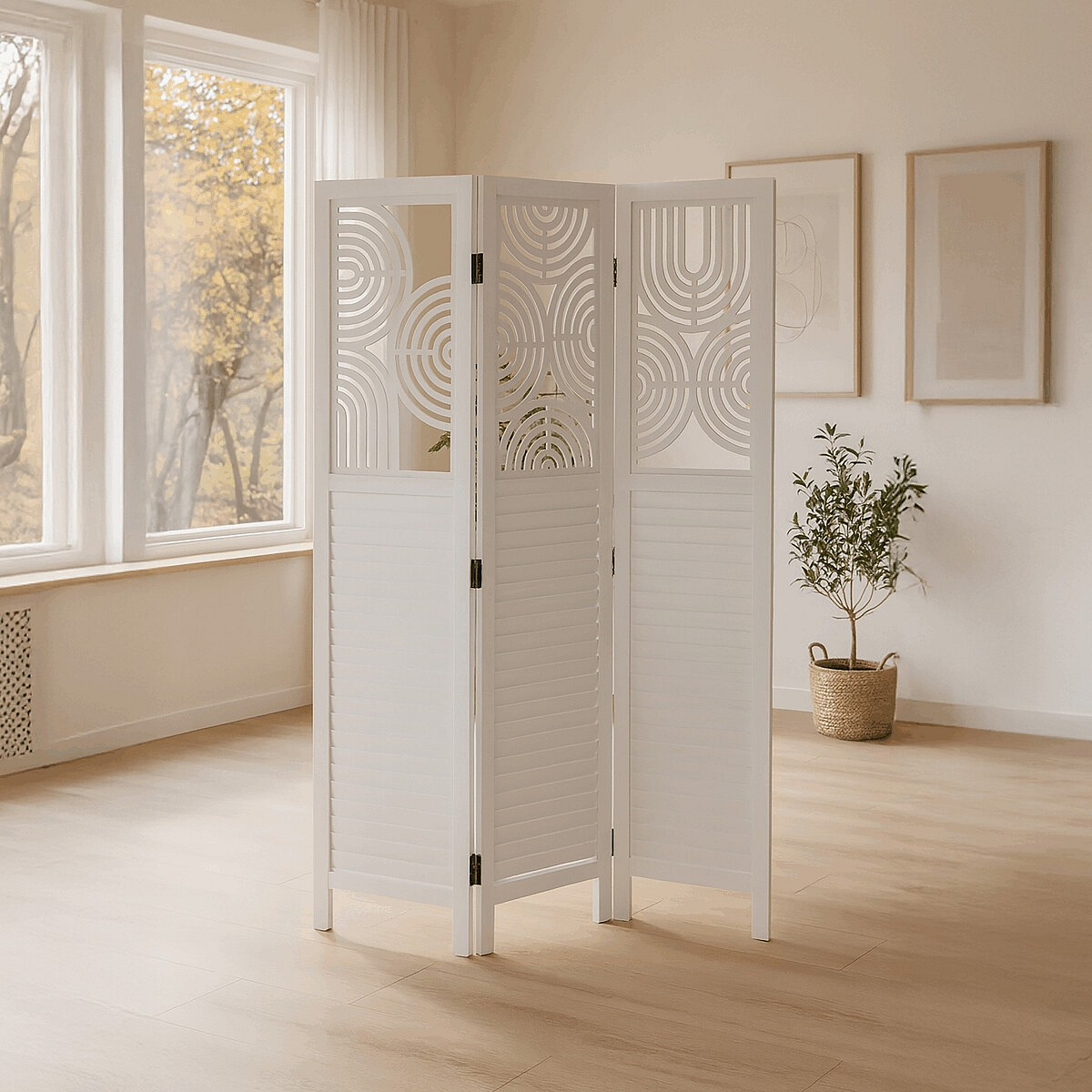 Třípanelový paraván vyrobený z masivního smrkového dřeva v bílé barvě nabízí praktické řešení pro rozdělení prostoru v interiéru. Každý díl je doplněn dekorativními výřezy v horní části, které propouštějí světlo a zároveň zachovávají soukromí. Masivní materiál zajišťuje pevnost a stabilitu, zatímco přírodní textura dřeva dodává výrobku přirozený vzhled. Paraván je vhodný pro použití v obývacích pokojích, ložnicích nebo kancelářích, kde pomáhá vytvořit útulné a funkční prostředí. Díky skládací konstrukci je snadno přemístitelný a skladovatelný.