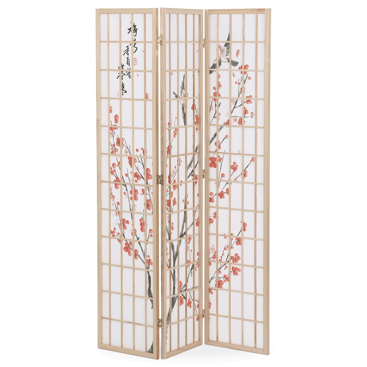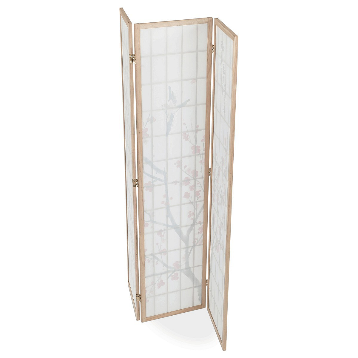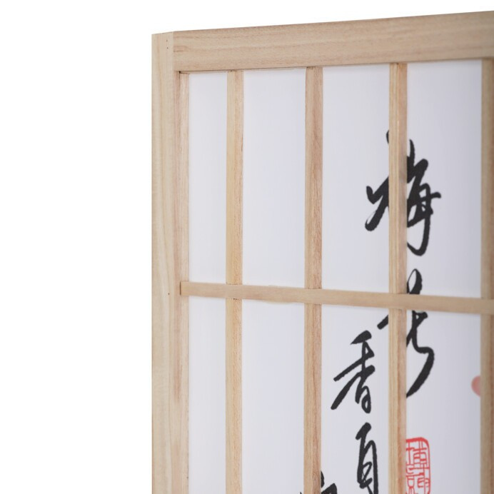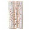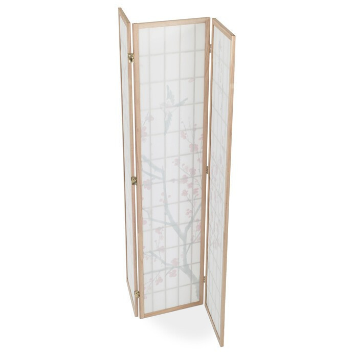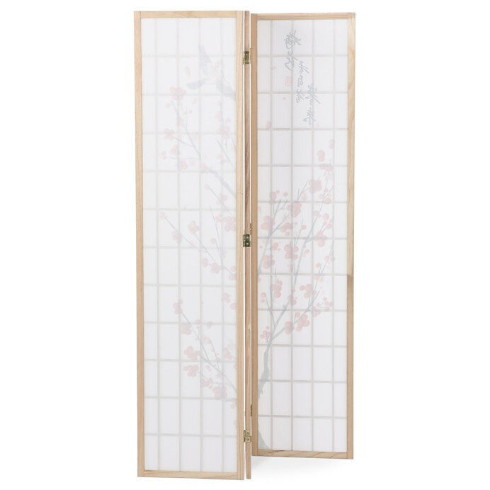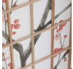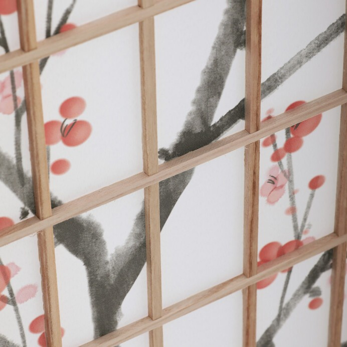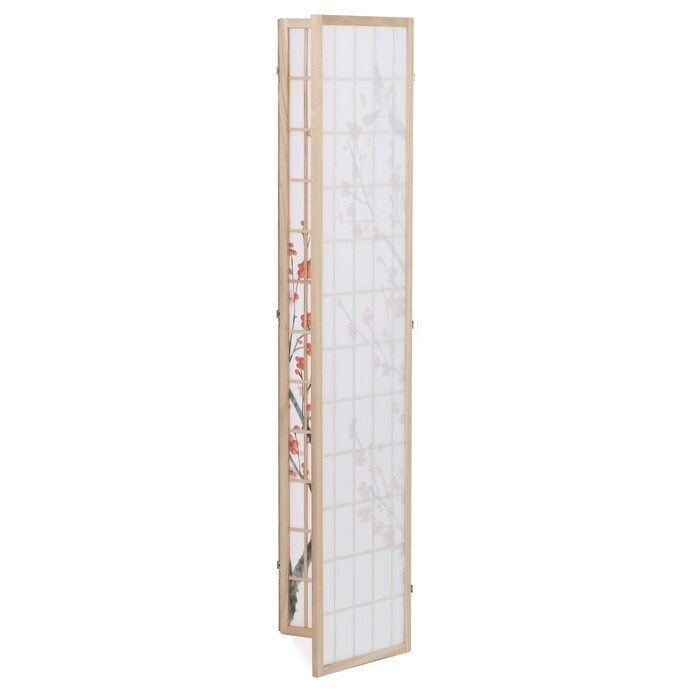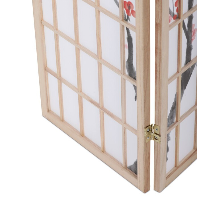 Třípanelový paraván z masivního smrkového dřeva v přírodním odstínu nabízí lehkou a vzdušnou přepážku s bílou netkanou textilií, která je zdobená jemným motivem větví s květy a ptáky v černých a červených tónech. Pevné dřevěné rámy zajišťují stabilitu a zároveň umožňují snadné skládání a přemístění. Paraván je vhodný pro optické oddělení prostoru v interiéru, přičemž jeho přírodní barevnost a decentní dekor vytvářejí klidnou atmosféru. Díky lehkému materiálu se snadno udržuje a je ideální pro použití v obývacích pokojích, ložnicích nebo kancelářích.