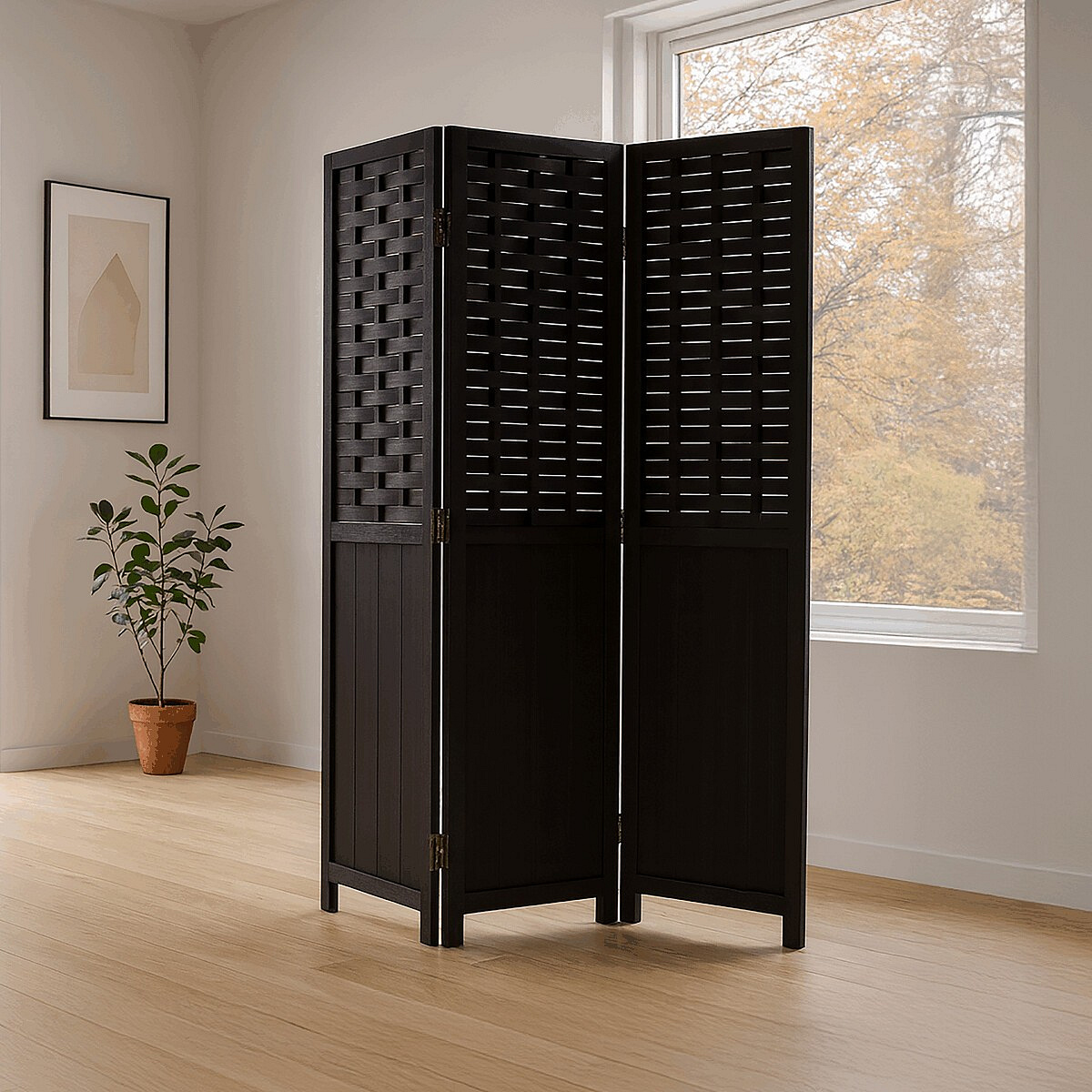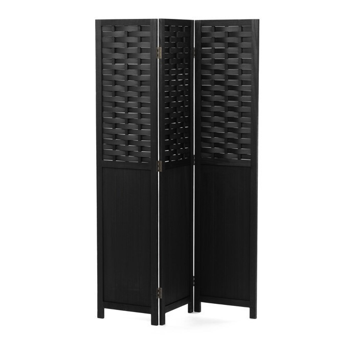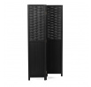 Třídílný paraván z masivního smrkového dřeva v černém provedení nabízí praktické řešení pro rozdělení prostoru s výrazným přírodním dekorem. Horní část tvoří propletené lamely, které propouštějí světlo a zároveň zajišťují dostatečnou míru soukromí, spodní část je tvořena plnou deskou s viditelnou strukturou dřeva. Pevné panty umožňují snadné skládání a přizpůsobení úhlu rozložení podle potřeby. Povrchová úprava v černé barvě podtrhuje výraznou texturu dřeva a usnadňuje údržbu. Paraván je vhodný pro použití v interiérech, kde je potřeba opticky oddělit části místnosti nebo vytvořit dekorativní prvek.