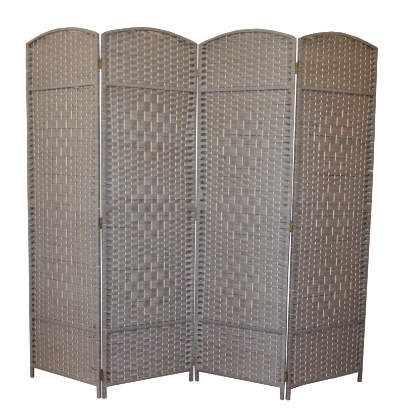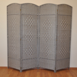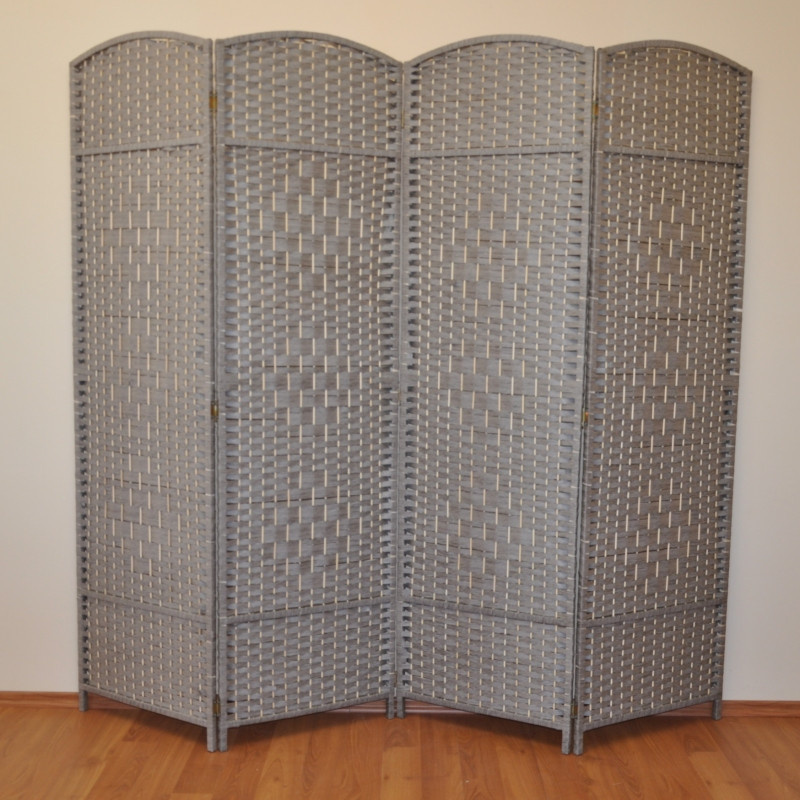 Štvordielna zástena je nielen vhodným bytovým doplnkom, ale slúži aj na oddelenie časti vnútorného protoru | Výška zásteny je 180 cm. Obrazovka sa skladá zo štyroch častí širokých 50 cm. Konštrukčný materiál je drevo, výplet je z farebných papierových šnúrok.