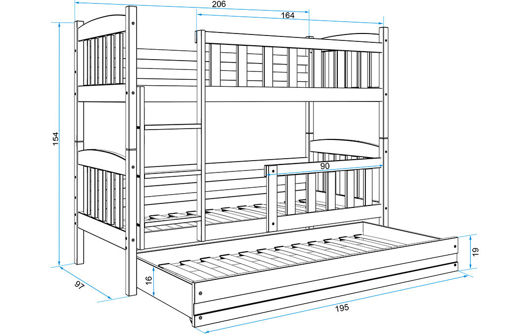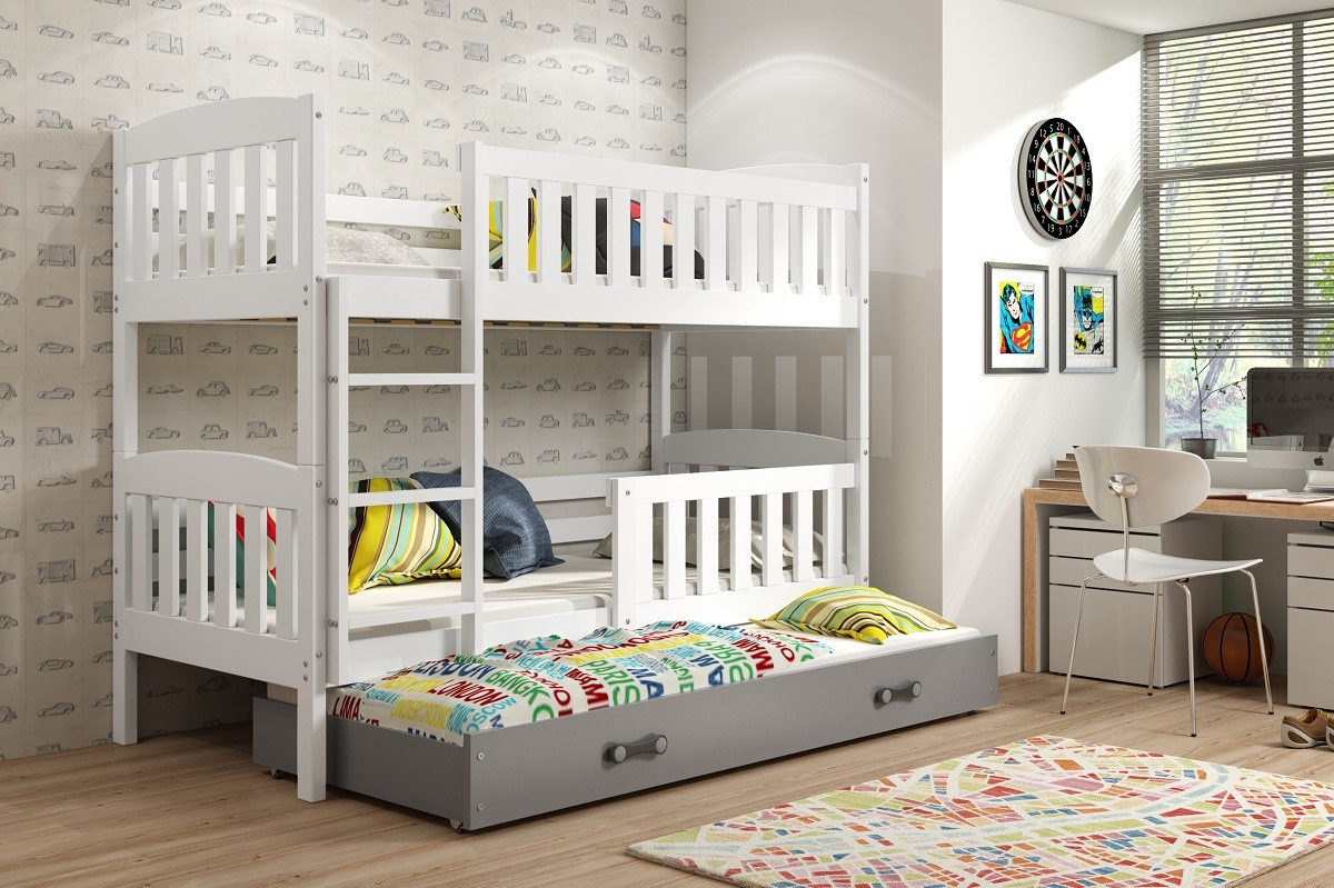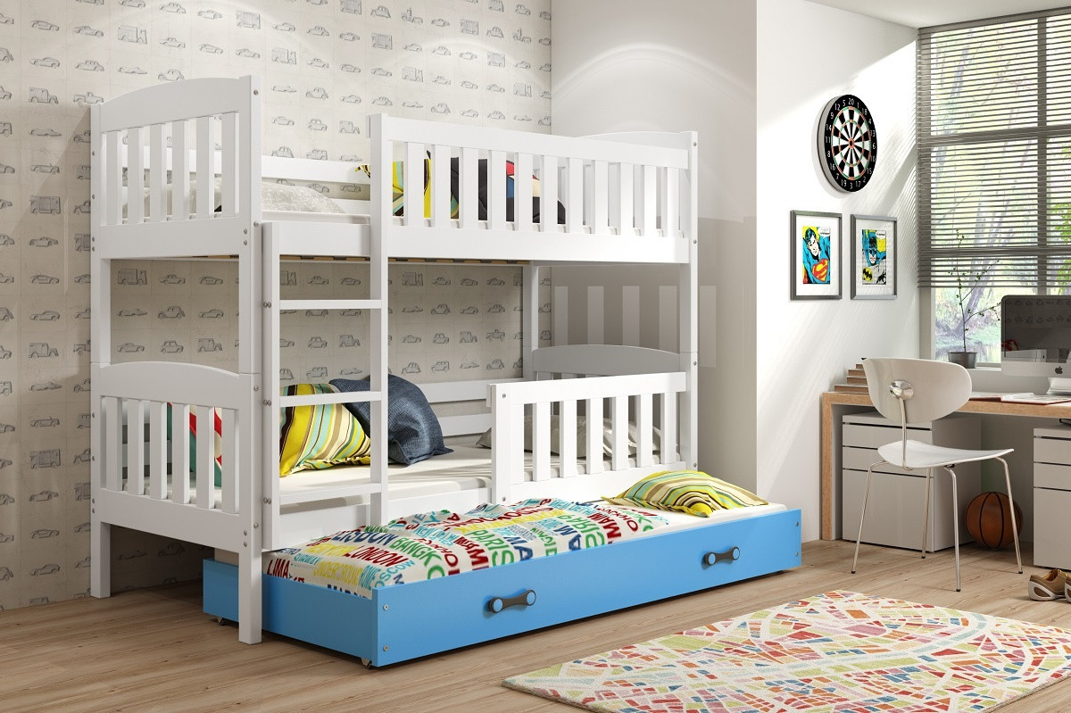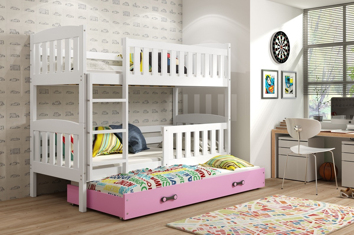 Poschodová posteľ Kuba je vynikajúcou voľbou pre všetkých rodičov, ktorí pre svoje dieťa hľadajúfunkčnosť, moderný dizajn a kvalitu. Posteľ je vyrobená z kvalitného borovicového dreva. Stabilná konštrukcia, zaoblené hrany a zábrana na hornom a dolnom lôžku zaisťujú bezpečnosť a pohodlie dieťaťa. Rebrík môžete podľa potreby umiestniť na pravú alebo ľavú stranu postele. Keď deti poschodová posteľ omrzí,možno jurozdeliť na dve samostatné postele. súčasťou postele je aj praktická prístelka s matracom, ktorú môžete použiť pre ďalšie dieťa, alebo keď vaše deti chcú, aby u nich prespal kamarát. Všetky časti postele sú vybavené roštom a penovým matracom. Hrúbka matraca je 7 cm. Plocha na spanie je 90x200 cm (horná a dolná časť) a 80x190 cm (prístelka). posteľ sa dodáva v demontovanom stave a obsahuje montážny plán vrátane všetkých potrebných spojovacích prvkov. Zobrazené príslušenstvo a dekorácie nie sú súčasťou balenia.Farby na fotografii sa môžu mierne líšiť od skutočnosti.