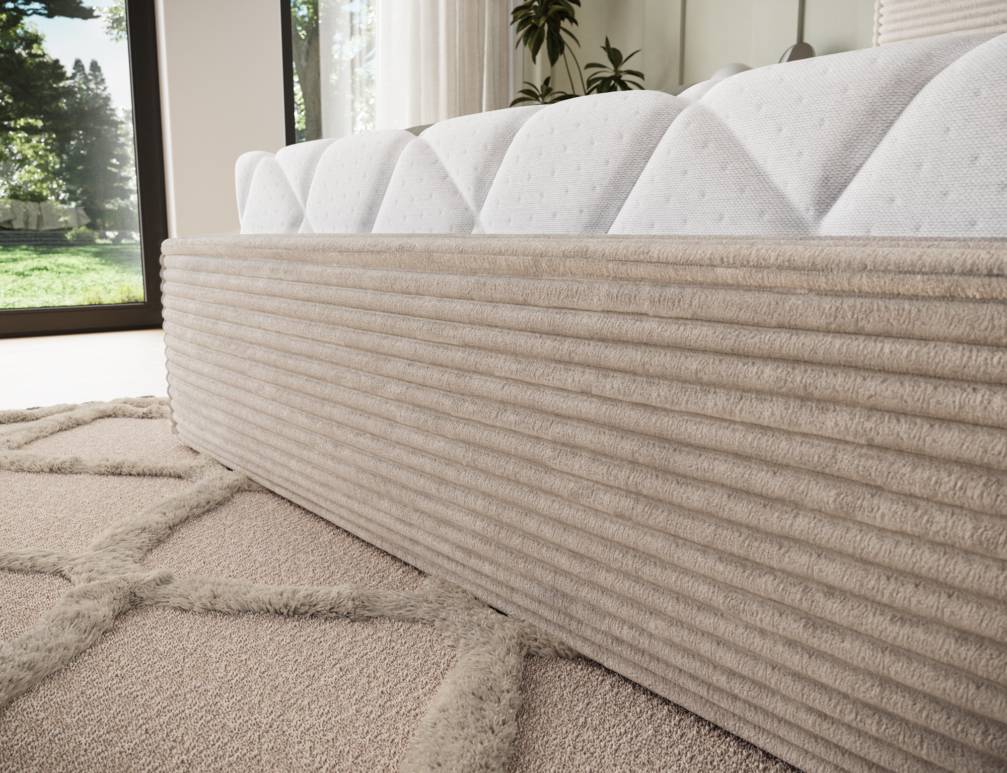 Posteľ do spálne Pesillo kombinuje eleganciu a funkčnosť v modernom dizajne. Model je k dispozícii v troch veľkostných variantoch: 140x200 cm, 160x200 cm a 180x200 cm, čo vám umožní dokonale prispôsobiť posteľ rozmerom vašej spálne a vašim individuálnym potrebám. Celková výška postele je 103 cm, zatiaľ čo jej hĺbka meria 220 cm. Šírka závisí od vybraného modelu a je 158 cm, 178 cm alebo 198 cm. Pěnová výplň T2130 zaisťuje pohodlie a odolnosť, zatiaľ čo robustné čierne plastové nohy nábytku poskytujú stabilitu a elegantný vzhľad. Posteľ Pesillo je vybavená praktickým úložným priestorom na posteľnú bielizeň, čo umožňuje efektívne využitie priestoru a jednoduchú organizáciu. Navrhnutý v modernom štýle, dokonale zapadá do súčasných trendov interiérového dizajnu, vytvára útulnú a elegantnú atmosféru ideálnu na relaxáciu.