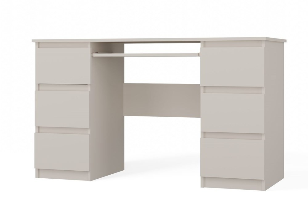 Funkčný písací stôl Kima v jednoduchom a modernom dizajne poskytuje dostatočnú pracovnú plochu a vďaka priestranným zásuvkám aj veľa úložného priestoru. Bezúchytkové čelá zásuviek zabezpečia pohodlné používanie. Stôl je vyrobený z ľahko udržiavateľného lamina, hrany sú zakončené vysoko odolným ABS materiálom.