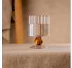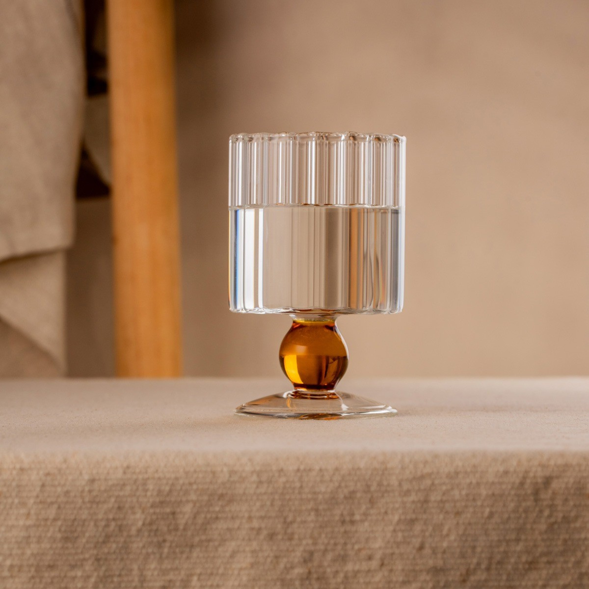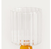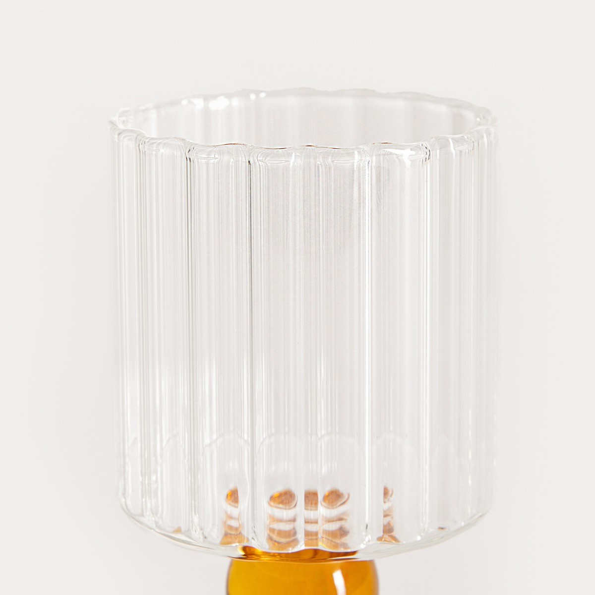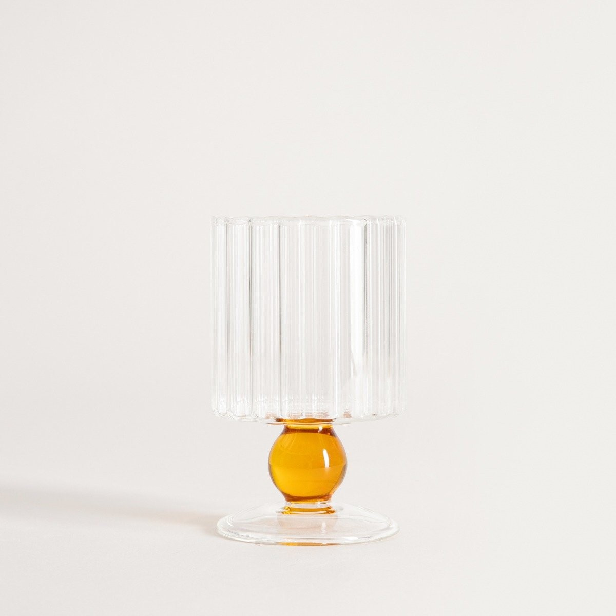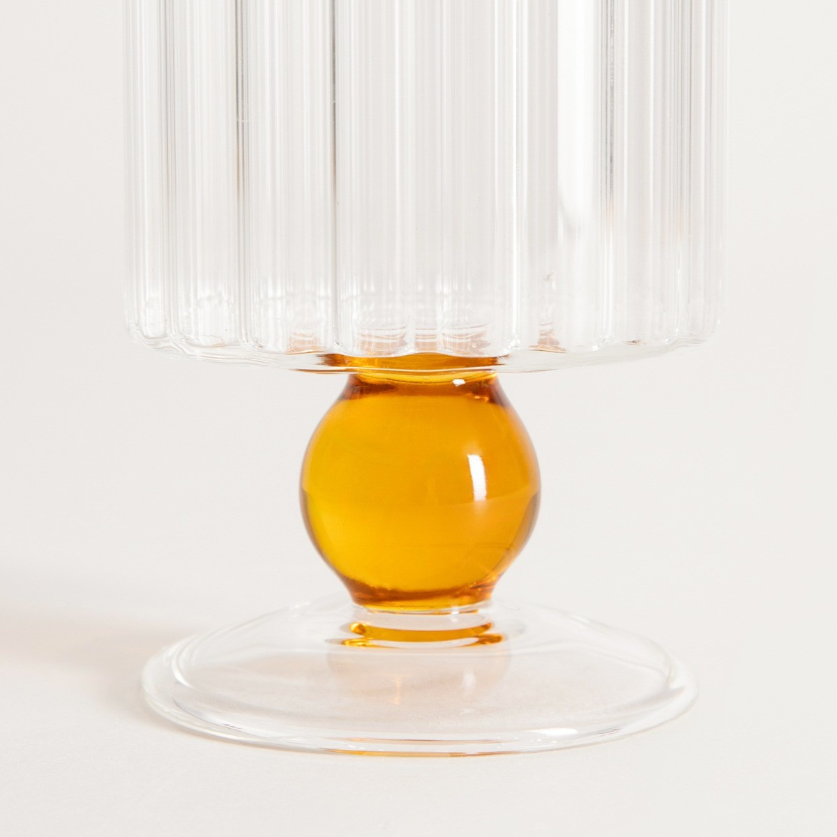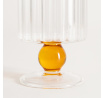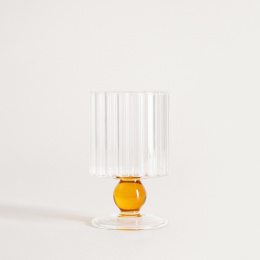 Pohár s moderným dizajnom má rýhovanú čašu a oranžovú nožičku v tvare guličky. Táto elegantná a funkčná nádoba, ktorá sa určite vyníma na vašom jedálenskom stole.