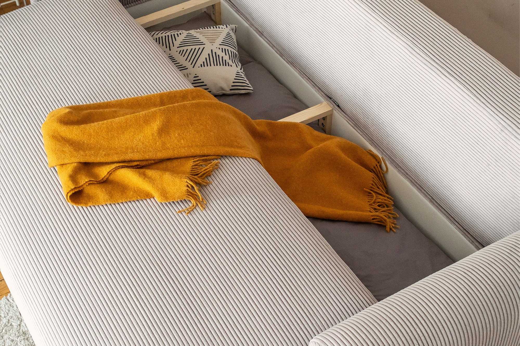Táto pohovka nie je len o vzhľade, ale aj o funkčnosti. Vďaka možnosti rozkladania sa ľahko premení na pohodlné lôžko s plochou na spanie 200 x 146 cm, čo je ideálne pre hostí alebo pre tých, ktorí si radi doprajú popoludňajší odpočinok. Navyše je vybavená praktickým úložným priestorom, ktorý je ideálny na uschovanie posteľnej bielizne, vankúšov alebo diek.