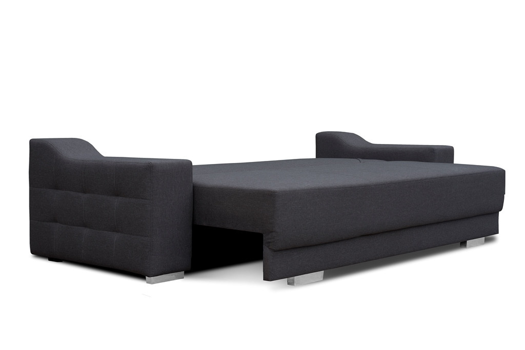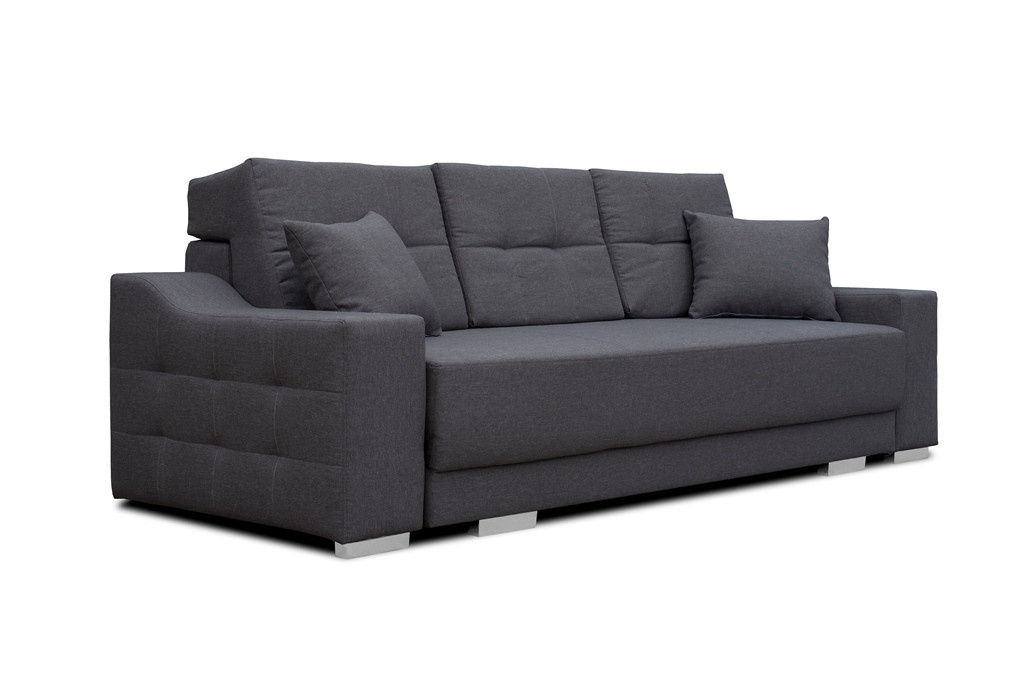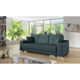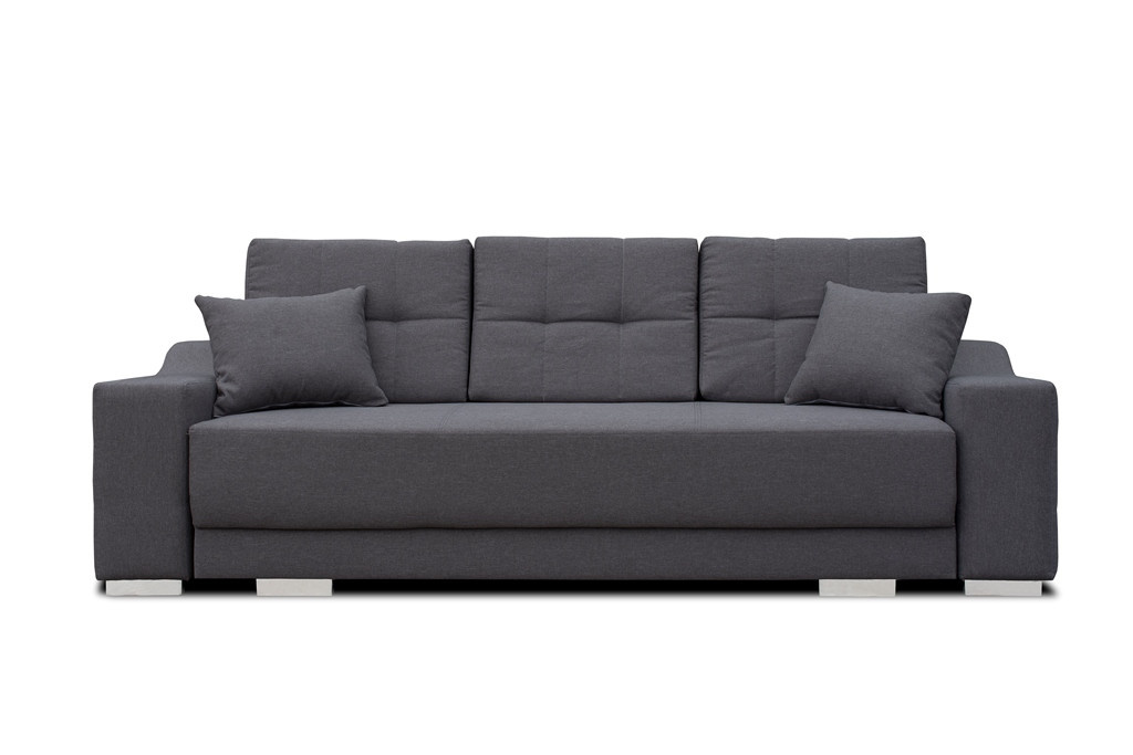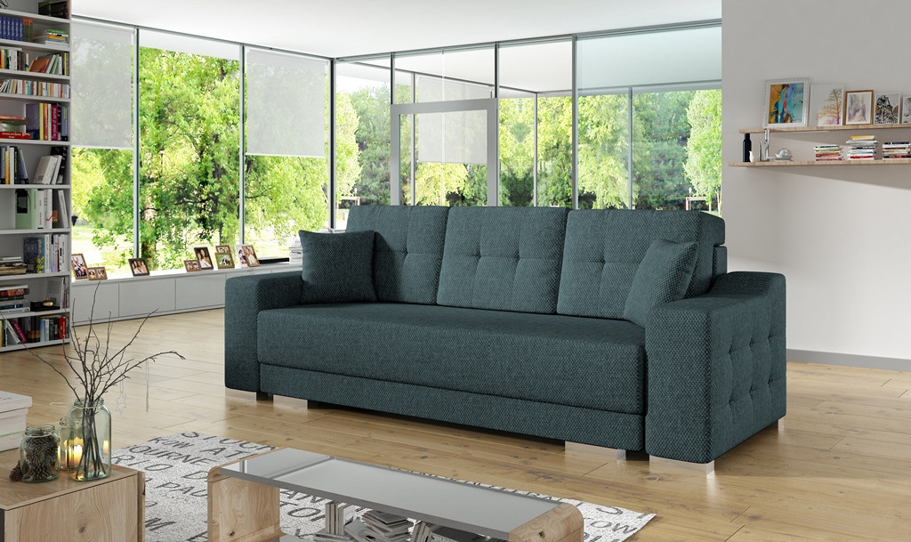 Modernistická pohovka CYPIS je masívna trojmiestna pohovka, ktorá bude atraktívnym a praktickým kusom nábytku do vašej obývacej izby alebo obývačky. Štýlová pohovka s bočnicami je kus nábytku s funkciou spania, ktorá zaručuje pohodlný a bezpečný spánok. Tento kus nábytku vyhotovený v škandinávskom dekore osloví aj tých najnáročnejších používateľov - pôsobí esteticky a zároveň poskytuje pohodlie a komfort aj pri dlhom sedení. Rozkladacia pohovka CYPIS je vybavená priestranným úložným priestorom na lôžkoviny a automatickým rozkladom, vďaka ktorému sa pohovka rýchlo a efektívne zmení na posteľ. Model CYPIS stojí na pevnom drevenom ráme a celú konštrukciu podopierajú chrómové nohy, ktoré nábytku dodávajú moderný charakter. Výplň pohovky je vyrobená z vlnitých pružín, ktoré zachovávajú primeranú pružnosť sedadla a operadla. Súprava s pohovkou obsahuje dva dekoračné vankúše. Voľne stojaca pohovka CYPIS vás poteší prešívanými bočnicami a prešívaním viditeľným na tvarovanom operadle. Pohovka do obývačky môže byť čalúnená látkou alebo ekokožou v širokej škále farieb, z ktorých si môžete vybrať.