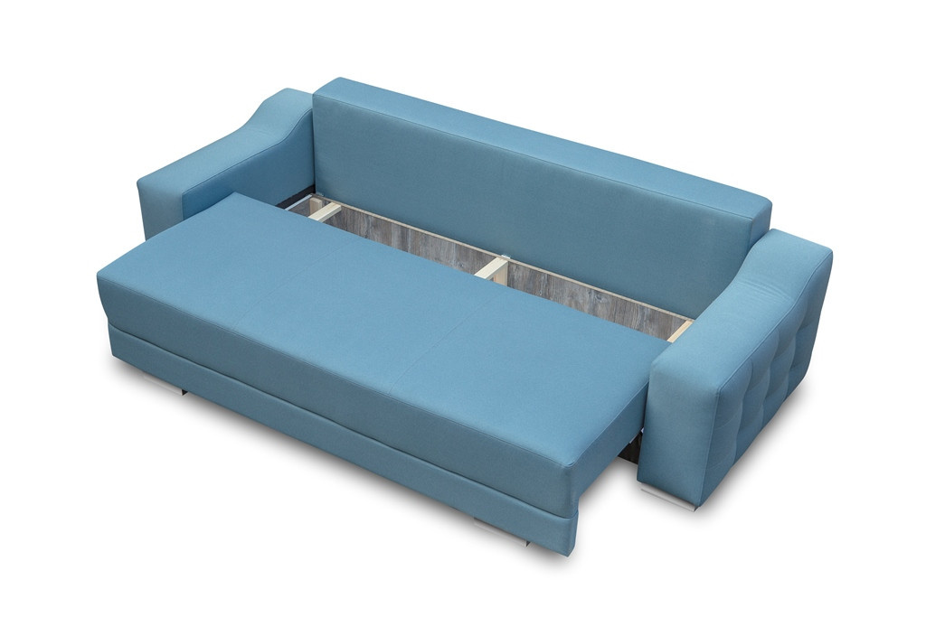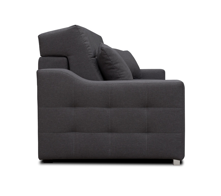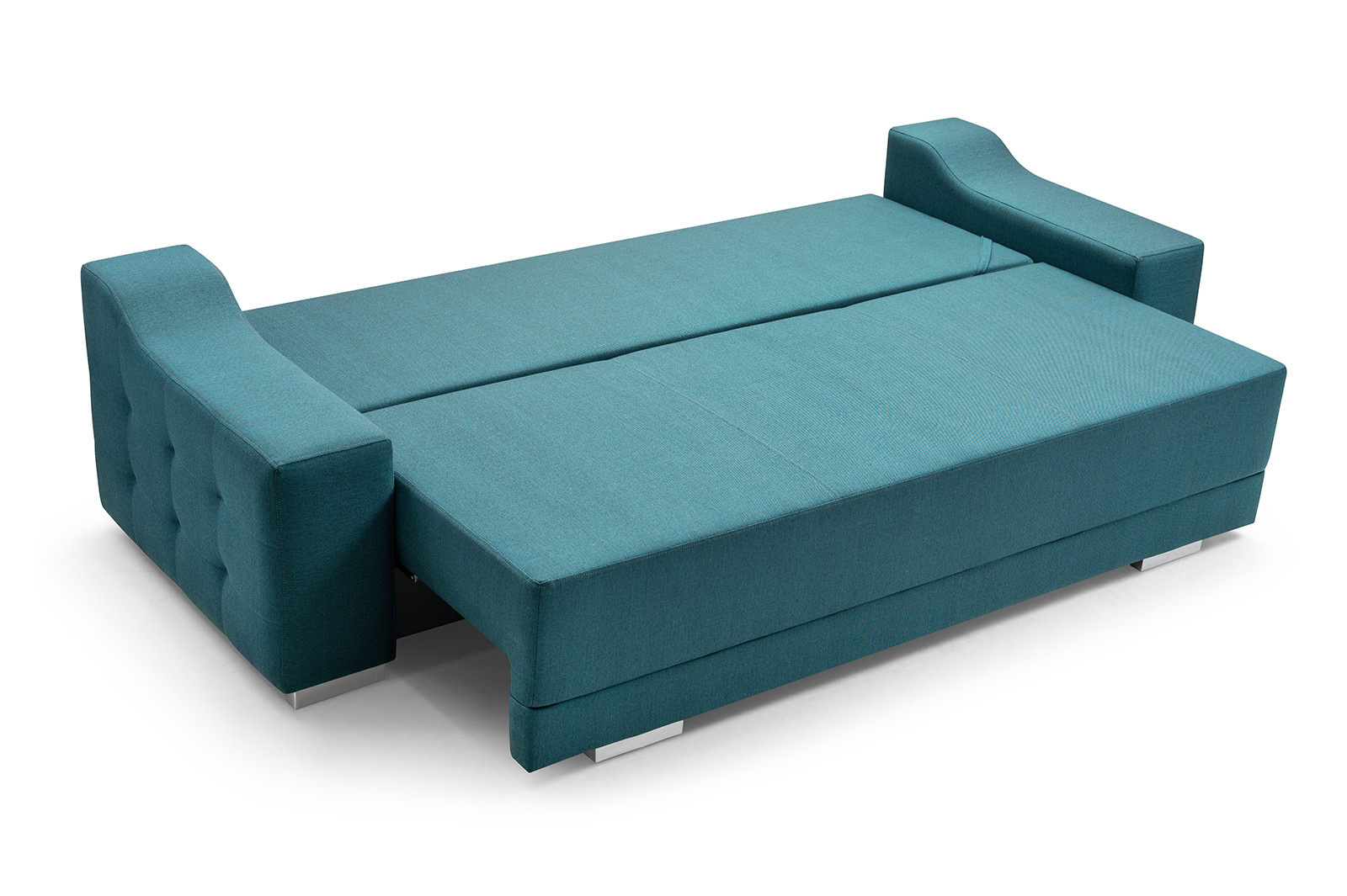 Modernistická pohovka CYPIS je masívna trojmiestna pohovka, ktorá bude atraktívnym a praktickým kusom nábytku do vašej obývacej izby alebo obývačky. Štýlová pohovka s bočnicami je kus nábytku s funkciou spania, ktorá zaručuje pohodlný a bezpečný spánok. Tento kus nábytku vyhotovený v škandinávskom dekore osloví aj tých najnáročnejších používateľov - pôsobí esteticky a zároveň poskytuje pohodlie a komfort aj pri dlhom sedení. Rozkladacia pohovka CYPIS je vybavená priestranným úložným priestorom na lôžkoviny a automatickým rozkladom, vďaka ktorému sa pohovka rýchlo a efektívne zmení na posteľ. Model CYPIS stojí na pevnom drevenom ráme a celú konštrukciu podopierajú chrómové nohy, ktoré nábytku dodávajú moderný charakter. Výplň pohovky je vyrobená z vlnitých pružín, ktoré zachovávajú primeranú pružnosť sedadla a operadla. Súprava s pohovkou obsahuje dva dekoračné vankúše. Voľne stojaca pohovka CYPIS vás poteší prešívanými bočnicami a prešívaním viditeľným na tvarovanom operadle. Pohovka do obývačky môže byť čalúnená látkou alebo ekokožou v širokej škále farieb, z ktorých si môžete vybrať.