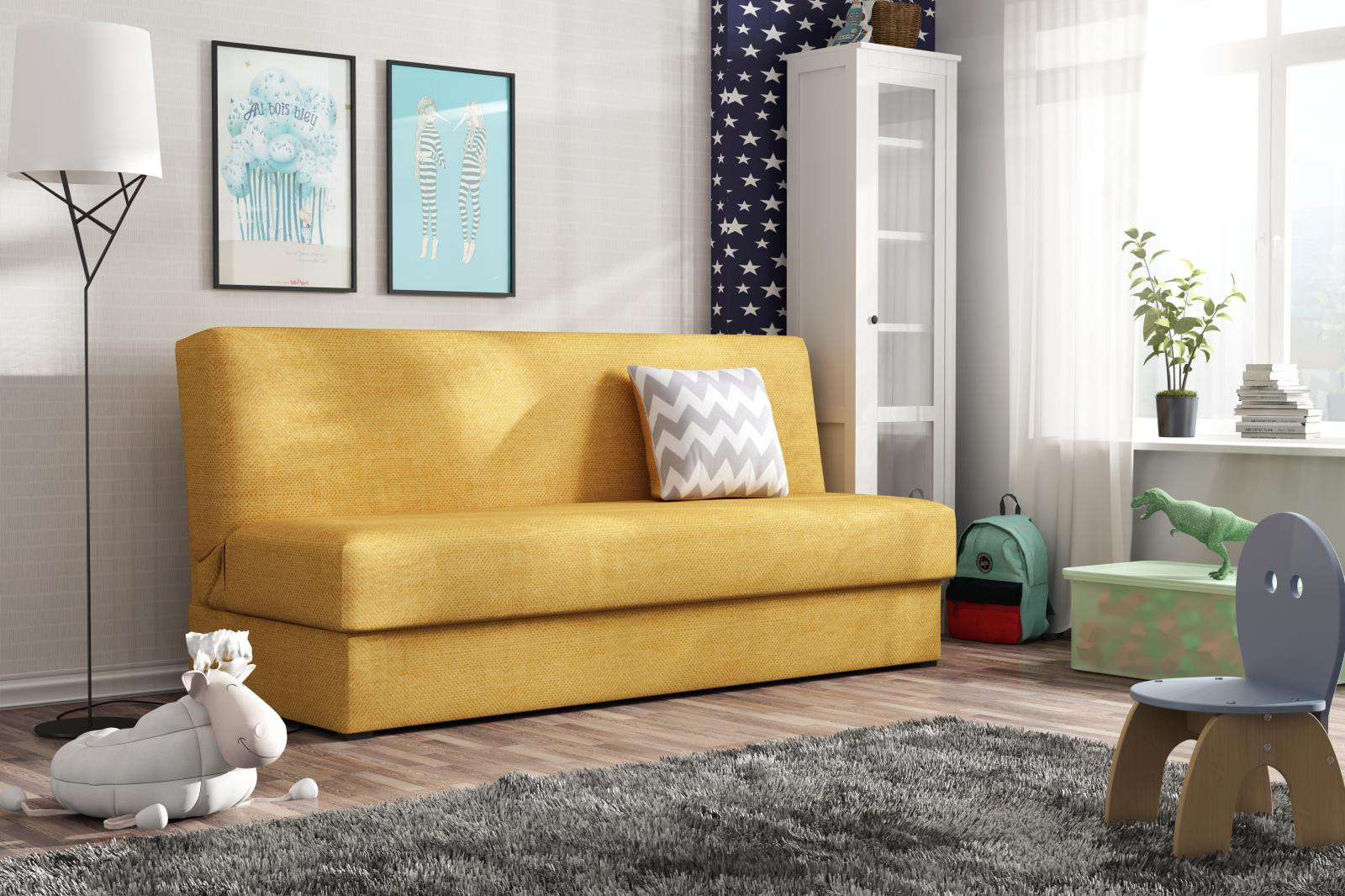 Pohovka Deli Mini je vyrobená v jednoduchom a nadčasovom dizajne, ktorý sa hodí do každého priestoru. Môže sa použiť v obývacej alebo študentskej izbe, prípadne v izbe pre hostí. Vďaka svojim rozmerom je vhodný aj do malých miestností. Pohovka je rozkladacia a má praktický úložný priestor. Sedák je vyplnený kombináciou pružín bonell a vysokokvalitnej PUR peny. Jednoduchým rozložením pomocou systému click-clack sa vytvorí posteľ na príležitostné spanie. Pohovku ponúkame vo viacerých farbách. Vzorka látky, v ktorej bude pohovka dodaná, je zobrazená na dodatočných fotografiách. V cene je zahrnutý malý dekoratívny vankúšik. Ostatné zobrazené príslušenstvo a dekorácie nie sú súčasťou balenia. Farby výrobku zobrazené na fotografii sa môžu mierne líšiť od skutočnosti.