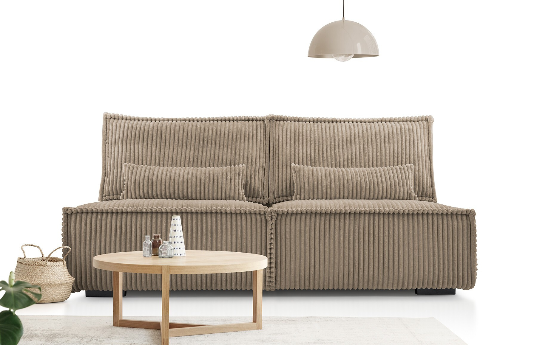 Vďaka kompaktnému tvaru bez bočných panelov je táto pohovka ideálna do malých miestností a zároveň poskytuje priestor pre tri osoby.
