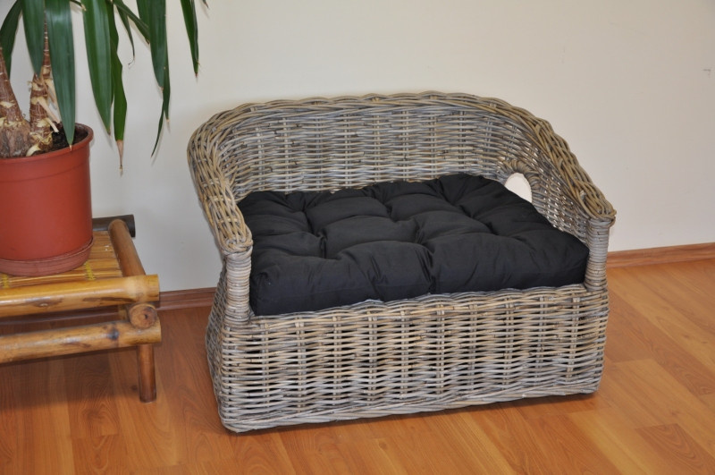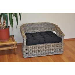 Pohovka pre vášho psíka ručne pletená z ratanu kubu v prírodnej šedej farbe. Ratan kubu sa vyznačuje vysokou pevnosťou a odolnosťou. Pohovku dodávame vrátane mäkkého vankúša. | Veľkosť pohovky je 83x60x51 cm Výška sedu je 30 cm. Veľkosť vankúša v čiernej farbe poťahovej látky je 65x50 cm. Vzhľadom na to, že pohovka je vyrobená z rovnako masívneho ratanu ako sedacie súpravy pre dospelých ľudí, nemusíte sa obávať, že by táto pohovka vášho miláčika neunesla.
