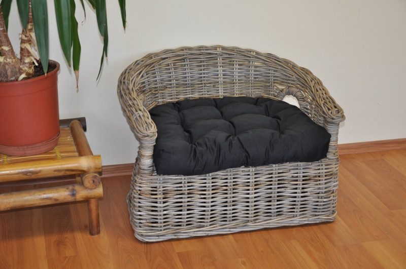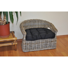 Pohovka pre vášho psíka ručne pletená z ratanu kubu v prírodnej šedej farbe. Ratan kubu sa vyznačuje vysokou pevnosťou a odolnosťou. Pohovku dodávame vrátane mäkkého vankúša. | Veľkosť pohovky je 70x57x48 cm Výška sedu je 30 cm. Veľkosť vankúša v čiernej farbe poťahovej látky je 54x47 cm. Vzhľadom na to, že pohovka je vyrobená z rovnako masívneho ratanu ako sedacie súpravy pre dospelých ľudí, nemusíte sa obávať, že by táto pohovka vášho miláčika neunesla.