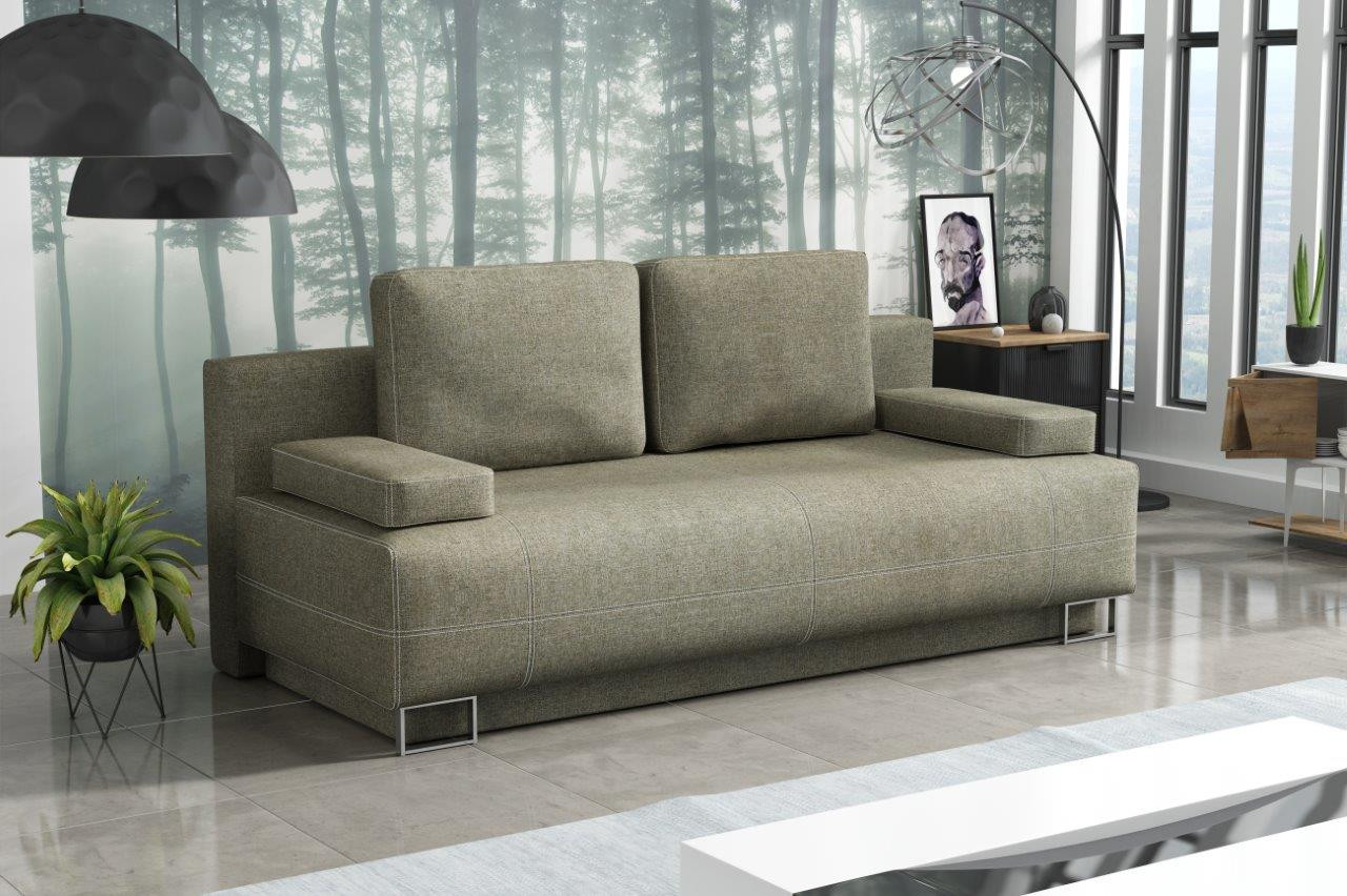 Pohovka Timmy je krásna a elegantná pohovka, ktorá sa dokonale hodí do každého interiéru. Pohovka je veľmi pohodlná a praktická. Praktickým aspektom pohovky je možnosť rozkladu - jednoduchým rozložením pomocou automatu vznikne dostatočne priestranné lôžko na príležitostné prenocovanie návštev a, samozrejme, nechýba ani nevyhnutný úložný priestor. Pohodlie zabezpečuje sedák, ktorý pozostáva z bonellových pružín a kvalitnej PUR peny. Pohovka je čalúnená kvalitnou látkou a je k dispozícii v niekoľkých módnych odtieňoch. Zobrazenie farieb na fotografii sa môže líšiť od skutočnosti. Vyobrazené príslušenstvo a dekorácie nie sú zahrnuté v cene.