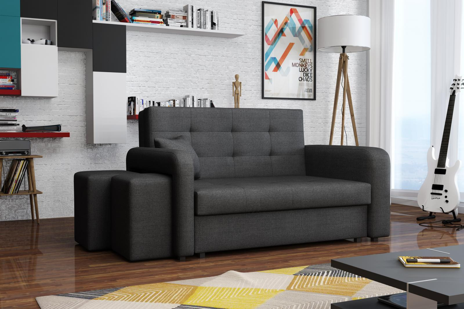 Vďaka svojim rozmerom jerozkladacia pohovka Vivian vhodná aj do menších miestností. Uplatnenie nájde nielen v obývacej izbe, ale aj v detskej, študentskej alebo hosťovskej izbe. Jednoduchým rozložením pomocou automatu získate posteľ na príležitostné prenocovanie návštevníkov. Výplň sedáku tvoria vlnité pružiny v kombinácii s PUR penou. Pohovka je čalúnená kvalitnou látkou a je k dispozícii v niekoľkých módnych odtieňoch. pohovka má aj nepostrádateľný úložný priestor, ktorý môžete využiť napr. na prikrývku a vankúš. Súčasťou pohovky je 1 dekoračný vankúš a 2 taburetky, ktoré sú dômyselne umiestnené v podrúčke pohovky. Stoličky sa môžu používať na sedenie alebo na podopieranie nôh pri odpočinku. Ostatné zobrazené dekorácie nie sú súčasťou balenia.farby na fotografii sa môžu líšiť od skutočnosti z dôvodu nastavenia monitorov alebo displejov telefónov. Vyobrazené príslušenstvo a dekorácie nie sú zahrnuté v cene.