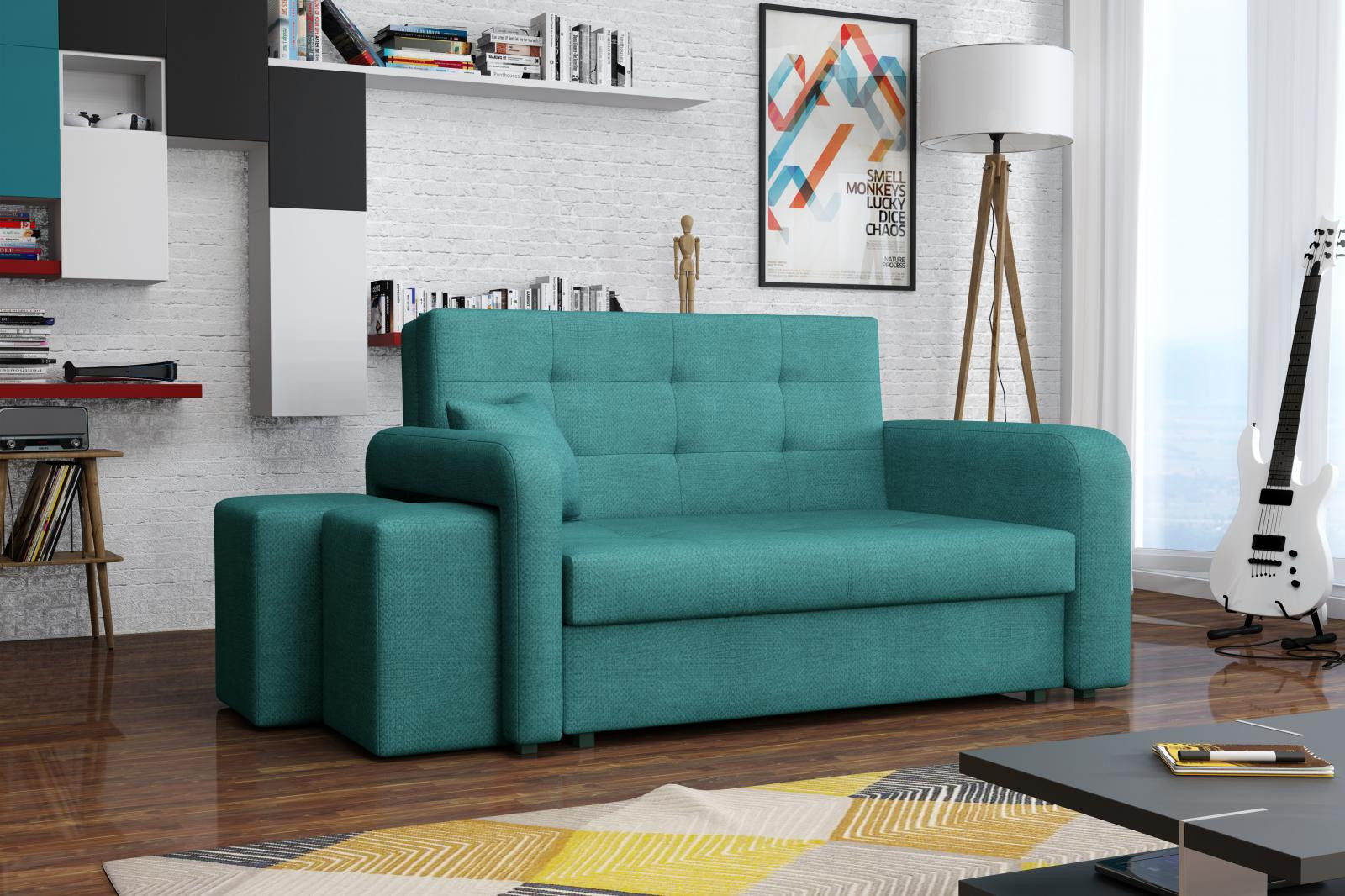 Vďaka svojim rozmerom jerozkladacia pohovka Vivian vhodná aj do menších miestností. Uplatnenie nájde nielen v obývacej izbe, ale aj v detskej, študentskej alebo hosťovskej izbe. Jednoduchým rozložením pomocou stroja získate posteľ na príležitostné prenocovanie návštev. Výplň sedáku tvoria vlnité pružiny v kombinácii s PUR penou. Pohovka je čalúnená kvalitnou látkou a je k dispozícii v niekoľkých módnych odtieňoch. pohovka má aj nepostrádateľný úložný priestor, ktorý môžete využiť napr. na prikrývku a vankúš. Súčasťou pohovky je 1 dekoračný vankúš a 2 taburetky, ktoré sú dômyselne umiestnené v podrúčke pohovky. Stoličky sa môžu používať na sedenie alebo na podopieranie nôh pri odpočinku. Ostatné zobrazené dekorácie nie sú súčasťou balenia.farby na fotografii sa môžu líšiť od skutočnosti z dôvodu nastavenia monitorov alebo displejov telefónov. Vyobrazené príslušenstvo a dekorácie nie sú zahrnuté v cene.