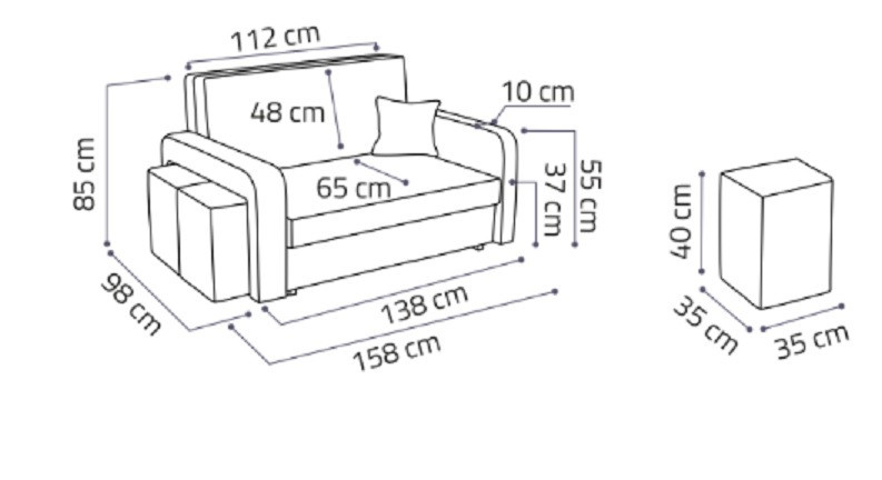 rozmery:šírka 138 cm, výška 85 cm, hĺbka 98 cm, stolička: 35x35 cm / výška 40 cm