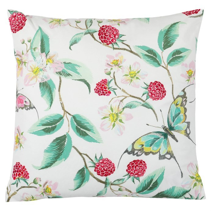 Elegantní polštář s výplní o rozměrech 45x45 cm a přírodním barevným motivem dokonale zútulní každý prostor. Jeho povrch je příjemně sametový na dotek a zdobí jej větvičky malin s červenými plody i bílými kvítky, vše je ještě doplněno motýly. Na světlém pozadí jeho barevný motiv vynikne a stane se neodolatelným estetickým doplňkem sedaček, křesel či pohovek v oblíbeném prostoru. Je velmi lehký a pohodlný, ale je spíše určen k ozdobné funkci. Díky němu přidáte svému interiéru syté barvy a letní svěžest. Zkuste si doma vytvořit jedinečnou letní atmosféru s tímto krásným polštářem.