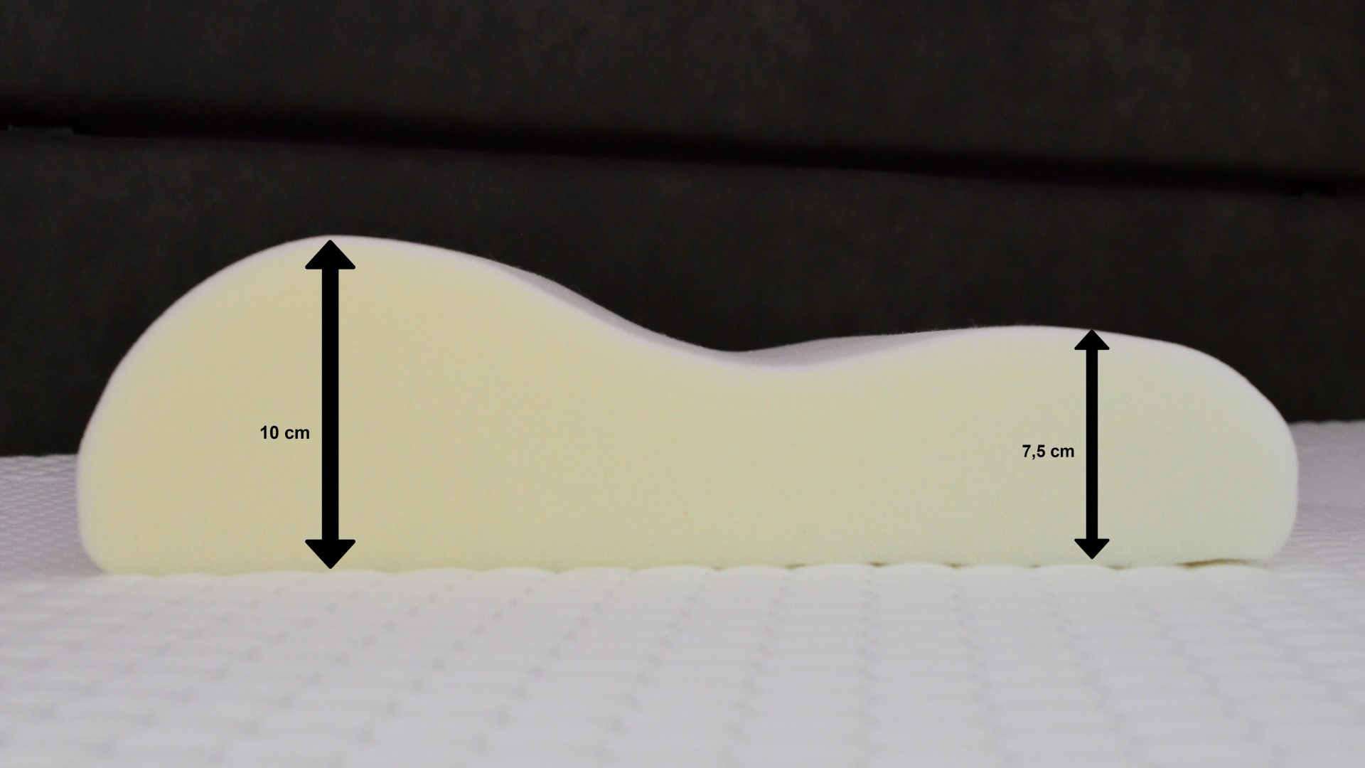 Najvyššia výška vankúša je 10 cm, z druhej strany 7,5 cm. Vankúš je možné otočiť a použiť z oboch strán, podľa toho, ktorá z výšok Vám bude viac vyhovovať.