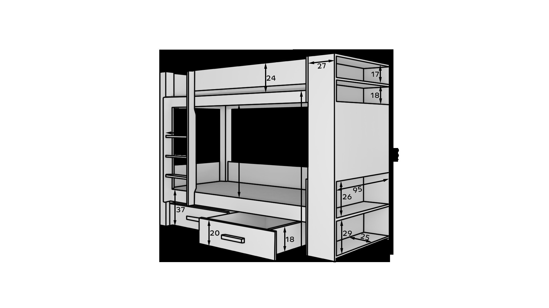 Poschodová 2-lôžková posteľ GARET je skvelý nápad na úsporu miesta v malej detskej izbe. Nábytok obsahuje schodíkový rebrík a dve priestranné a funkčné zásuvky na posteľnú bielizeň. Navyše na dvoch úrovniach boli namontované zábradlia zvyšujúce bezpečnosť počas spánku. Model GARET má police umiestnené ako z vnútornej, tak z vonkajšej strany postele. Matrace nie sú súčasťou postele.