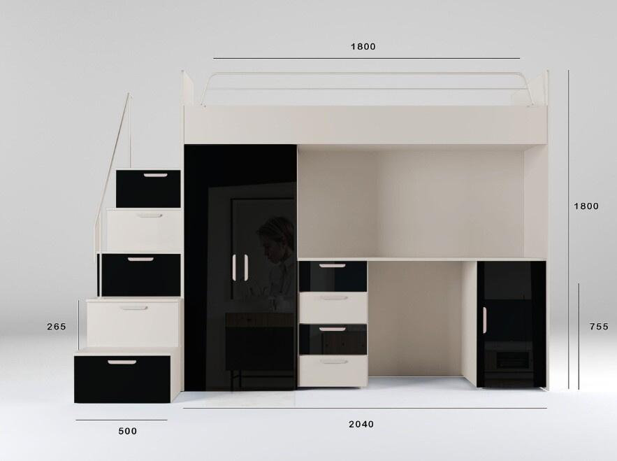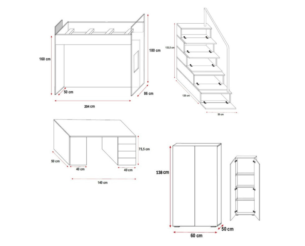Celkové rozmery postele sú 86 cm na šírku, 180 cm na výšku a 254 cm na dĺžku. Tieto rozmery zabezpečujú, že posteľ poskytuje dostatok priestoru pre pohodlný spánok, zatiaľ čo jej poschodová konštrukcia šetrí miesto v izbe. Je ideálnou voľbou pre menšie izby, kde je potrebné efektívne využiť každý centimeter.