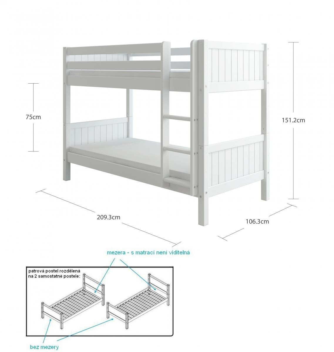 Tovar je dodávaný v demonte BEZ MATRACOV. Odporúčame dokúpiť 2 ks matraca 90 x 200 cm. Súčasťou je schematický návod na montáž vrátane všetkých spojovacích prvkov. Zobrazené doplnky a dekorácie nie sú v cene.