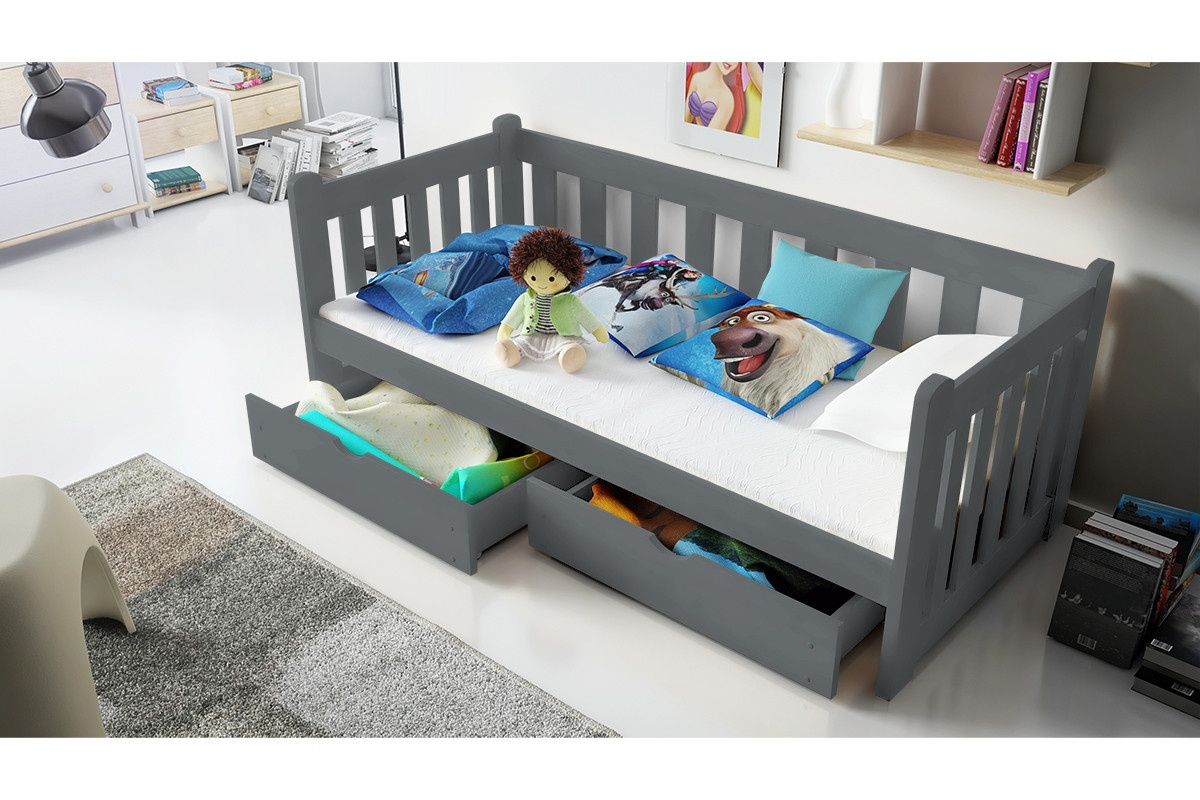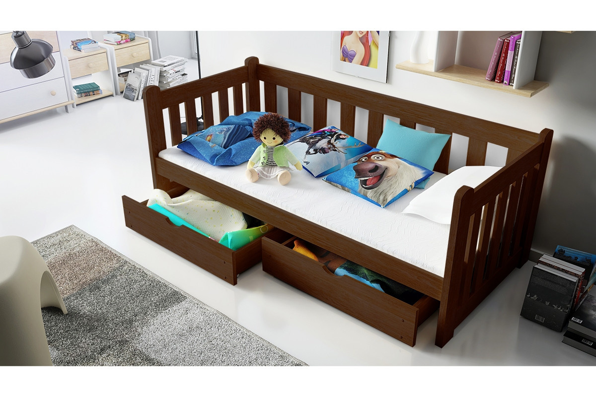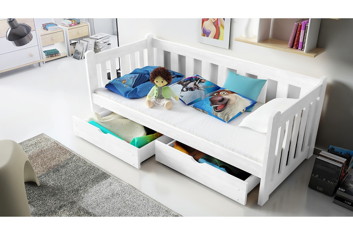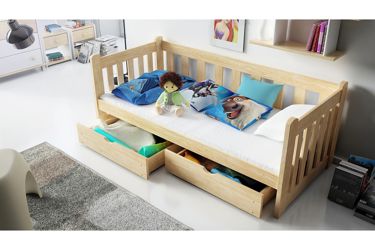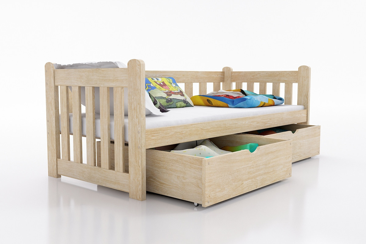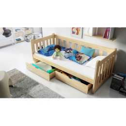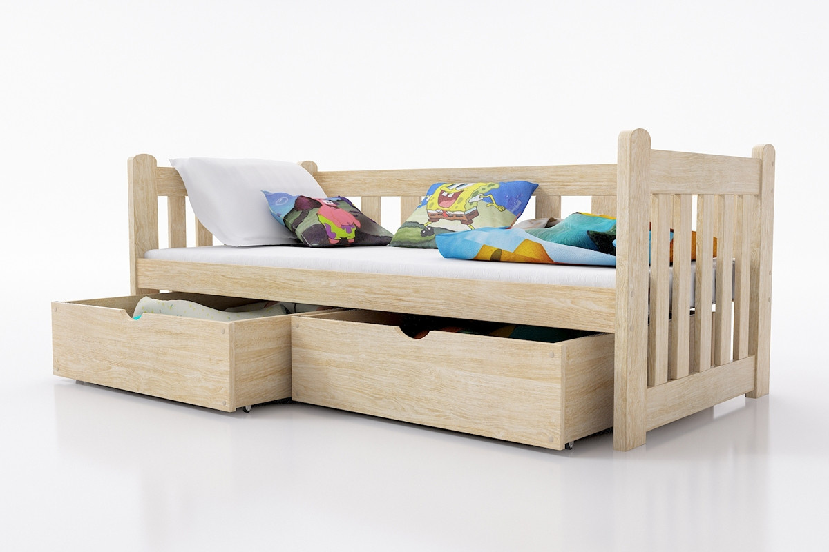 Drevená detská posteľ Swen DP 001, šírka: 187, výška: 74, hĺbka: 87, rozmer pre matrac: 180x80, montáž: vlastná. Poschodová posteľ z borovicového dreva. Sortiment je vybavený priestrannými zásuvkami a je k dispozícii v piatich veľkostiach matracov.