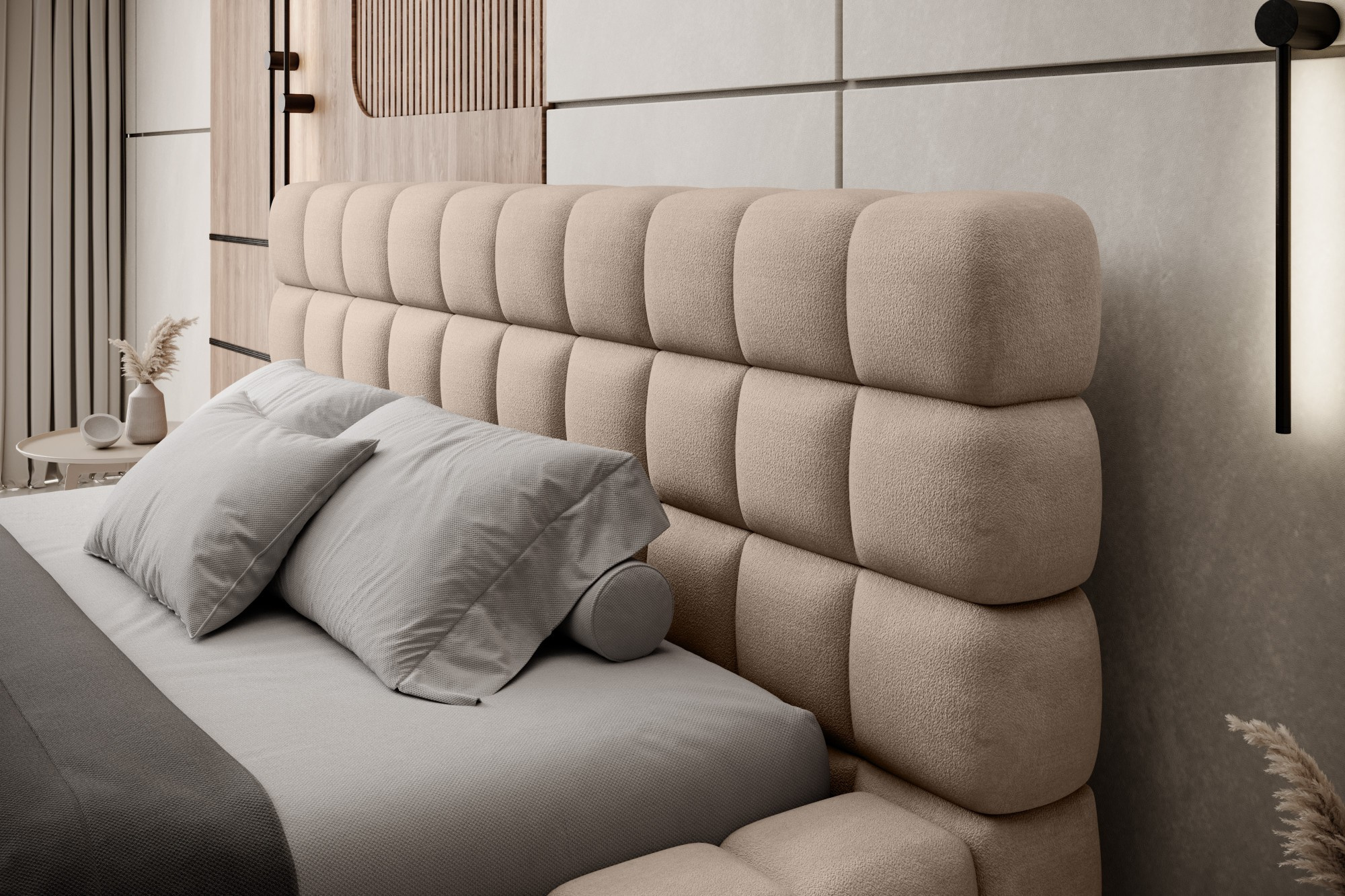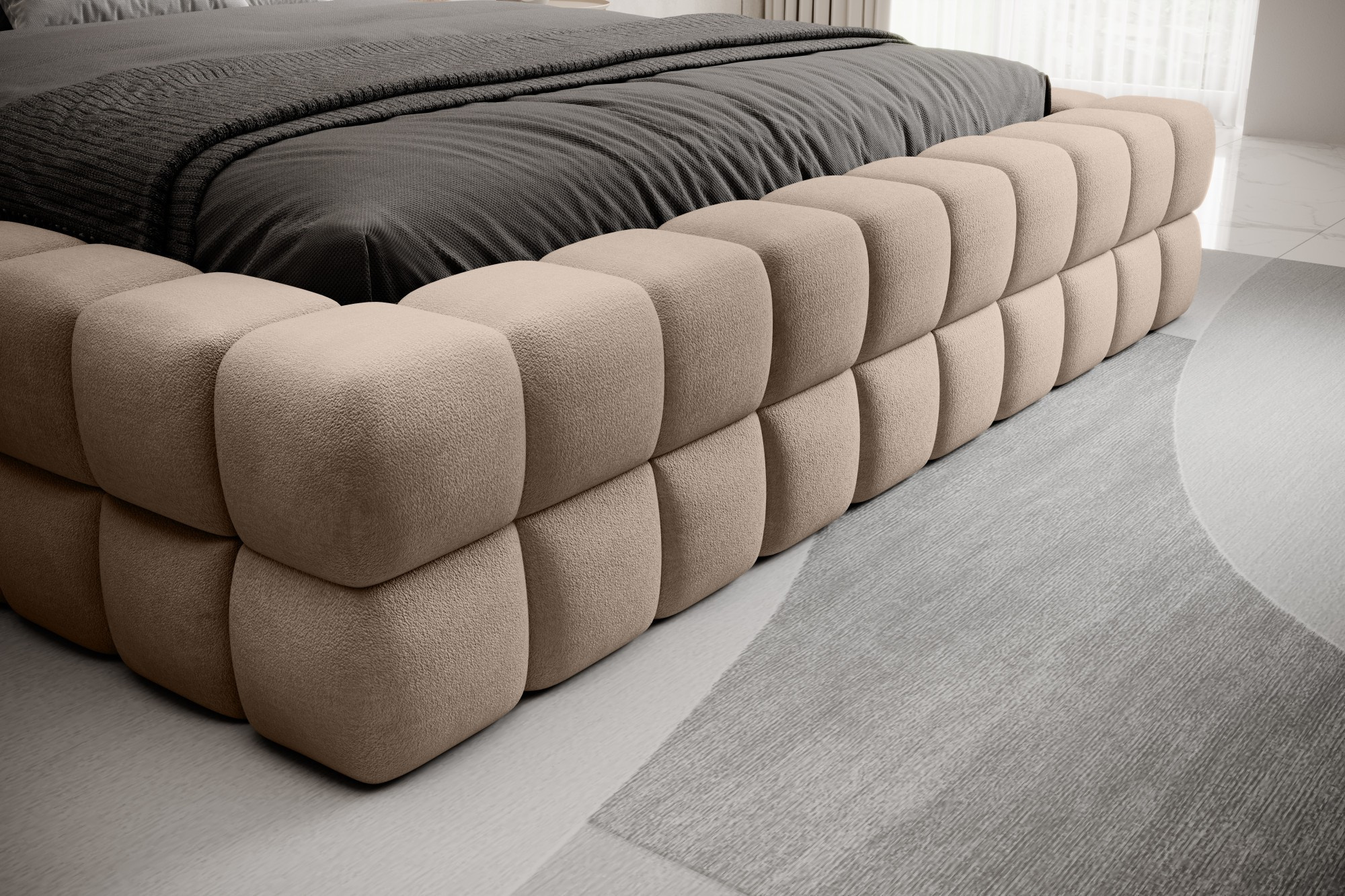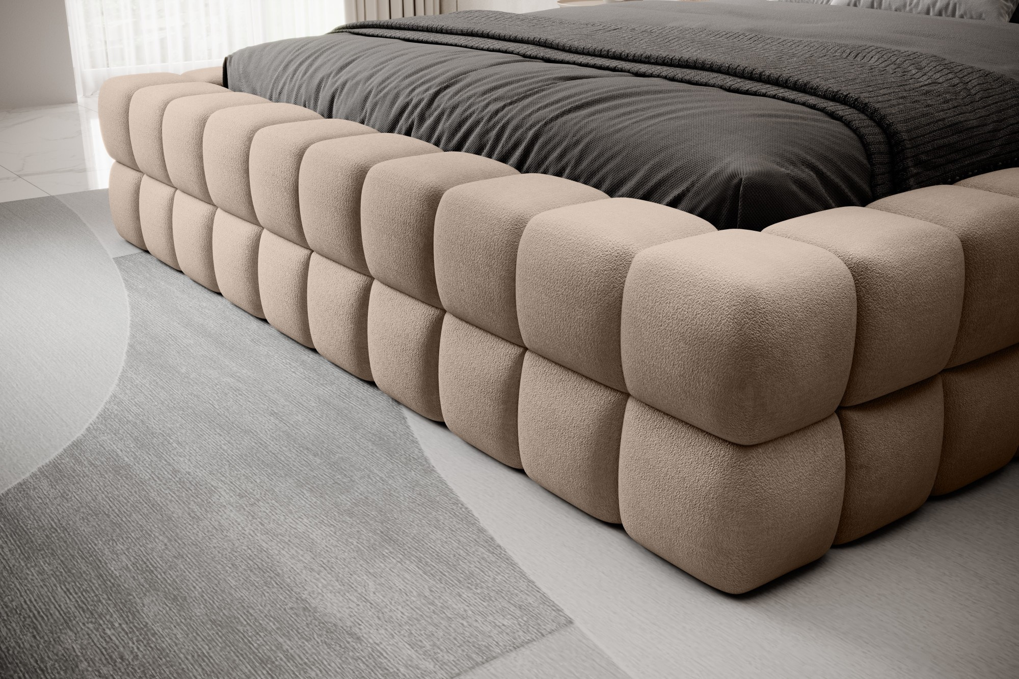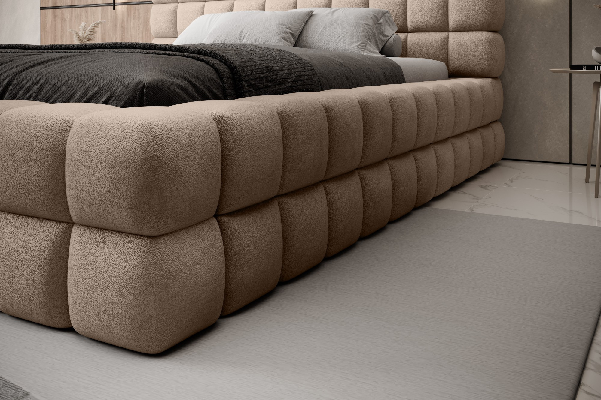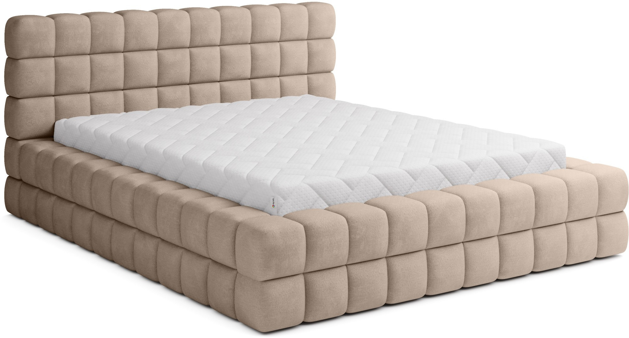 Posteľ Dizzle vo verzii so šírkou 160 cm je ideálnym riešením pre tých, ktorí hľadajú viac priestoru na spanie, bez toho aby museli zľaviť z elegancie a pohodlia. Používa penu T2130, ktorá zabezpečuje pružnosť a jedinečné pohodlie počas spánku. So tromi rôznymi možnosťami šírky je 160 cm ideálnym riešením pre priestranný spánok. Dĺžka postele je 225 cm a jej impozantná výška 104 cm dodáva celej konštrukcii eleganciu.Výška sedadla je 42 cm; odporúča sa však pridať výšku matraca pre dosiahnutie plného komfortu pri spánku. Čierne plastové nohy s výškou 2 cm zabezpečujú stabilitu a ľahký pohyb nábytku. Kovový rám zaručuje odolnosť konštrukcie a jedna úložná priehradka robí posteľ Dizzle praktickým miestom na uloženie ďalších vecí.S 36 lamelami pre rovnomernú podporu matraca prináša posteľ Dizzle, ktorej tvar pripomína elegantnú kocku, do vašej spálne priestranný spánok, štýlový dizajn a pohodlnú relaxáciu.