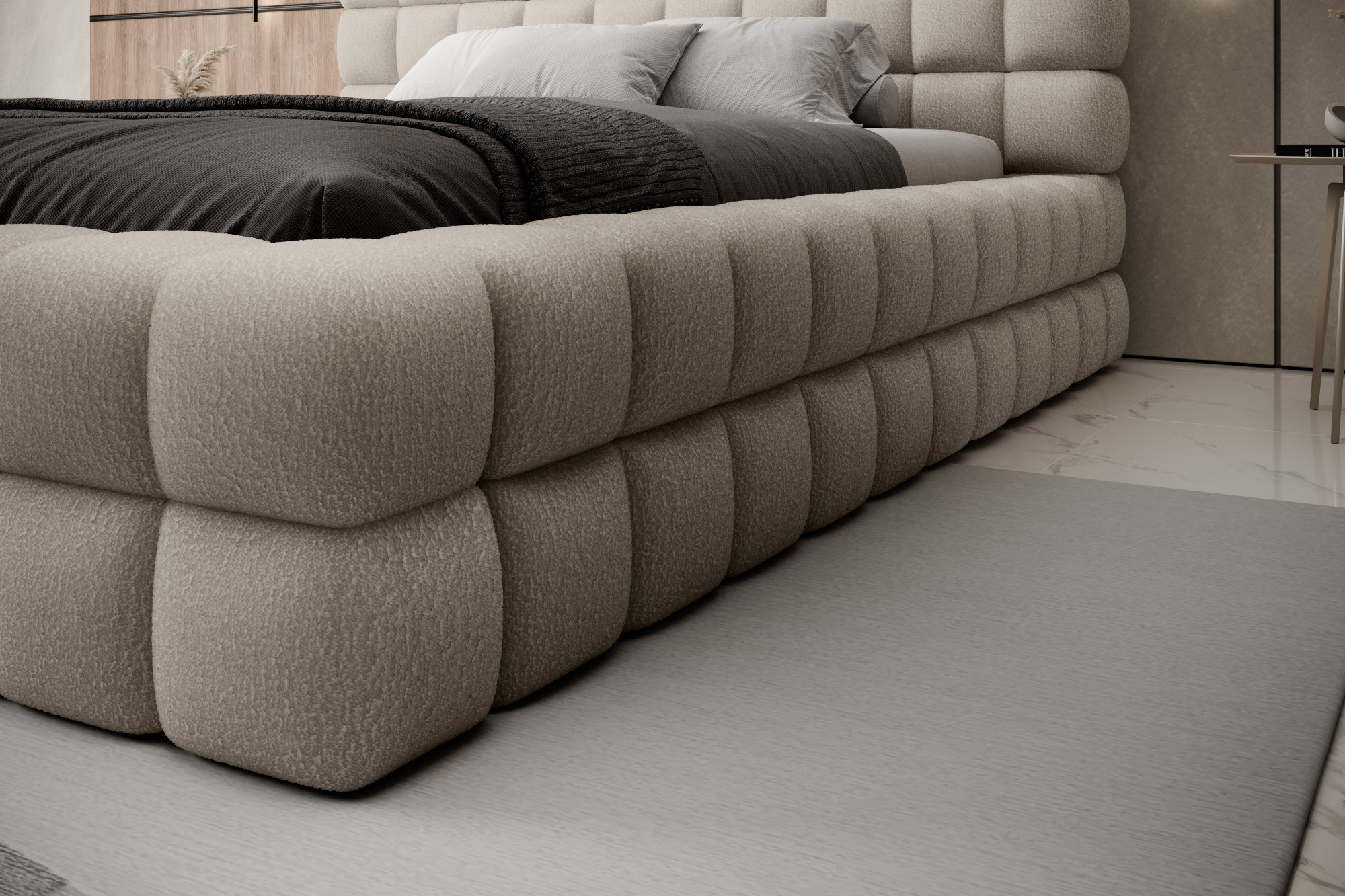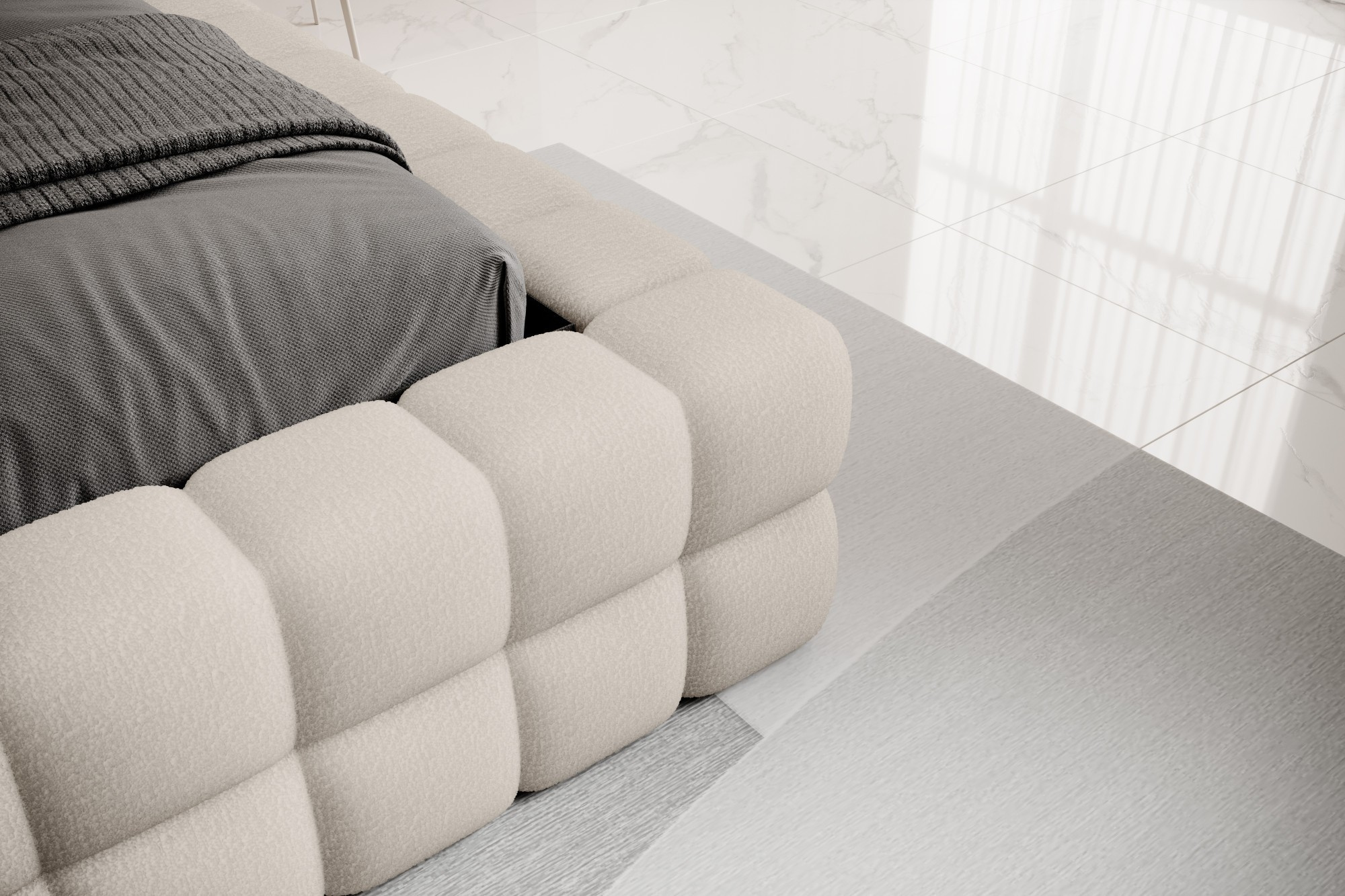 Posteľ Dizzle vo verzii so šírkou 160 cm je ideálnym riešením pre tých, ktorí hľadajú viac priestoru na spanie, bez toho aby museli zľaviť z elegancie a pohodlia. Používa penu T2130, ktorá zabezpečuje pružnosť a jedinečné pohodlie počas spánku. So tromi rôznymi možnosťami šírky je 160 cm ideálnym riešením pre priestranný spánok. Dĺžka postele je 225 cm a jej impozantná výška 104 cm dodáva celej konštrukcii eleganciu.Výška sedadla je 42 cm; odporúča sa však pridať výšku matraca pre dosiahnutie plného komfortu pri spánku. Čierne plastové nohy s výškou 2 cm zabezpečujú stabilitu a ľahký pohyb nábytku. Kovový rám zaručuje odolnosť konštrukcie a jedna úložná priehradka robí posteľ Dizzle praktickým miestom na uloženie ďalších vecí.S 36 lamelami pre rovnomernú podporu matraca prináša posteľ Dizzle, ktorej tvar pripomína elegantnú kocku, do vašej spálne priestranný spánok, štýlový dizajn a pohodlnú relaxáciu.
