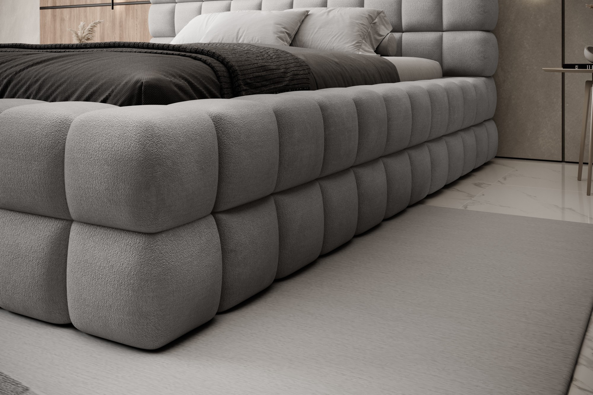 Posteľ Dizzle vo verzii s impozantnou šírkou 180 cm je ideálnym riešením pre tých, ktorí túžia po ešte väčšom priestore na spánok, bez toho aby obetovali eleganciu a pohodlie. Využíva penu T2130, ktorá poskytuje pružnosť a jedinečný spánkový komfort. So tromi rôznymi možnosťami šírky je 180 cm návrhom pre nadšencov priestrannosti. Dĺžka postele je 225 cm a jej impozantná výška 104 cm dodáva celej konštrukcii eleganciu.Výška sedadla je 42 cm; odporúča sa však pridať výšku matraca pre plný komfort pri používaní. Čierne plastové nohy s výškou 2 cm zabezpečujú stabilitu. Kovový rám zaručuje odolnosť konštrukcie a jedna úložná priehradka robí posteľ Dizzle 180 praktickým miestom na uloženie ďalších vecí.S 36 lamelami pre rovnomernú podporu matraca prináša posteľ Dizzle, ktorej tvar pripomína elegantnú kocku, do vašej spálne nielen priestrannosť, ale aj štýlový dizajn a pohodlnú relaxáciu.