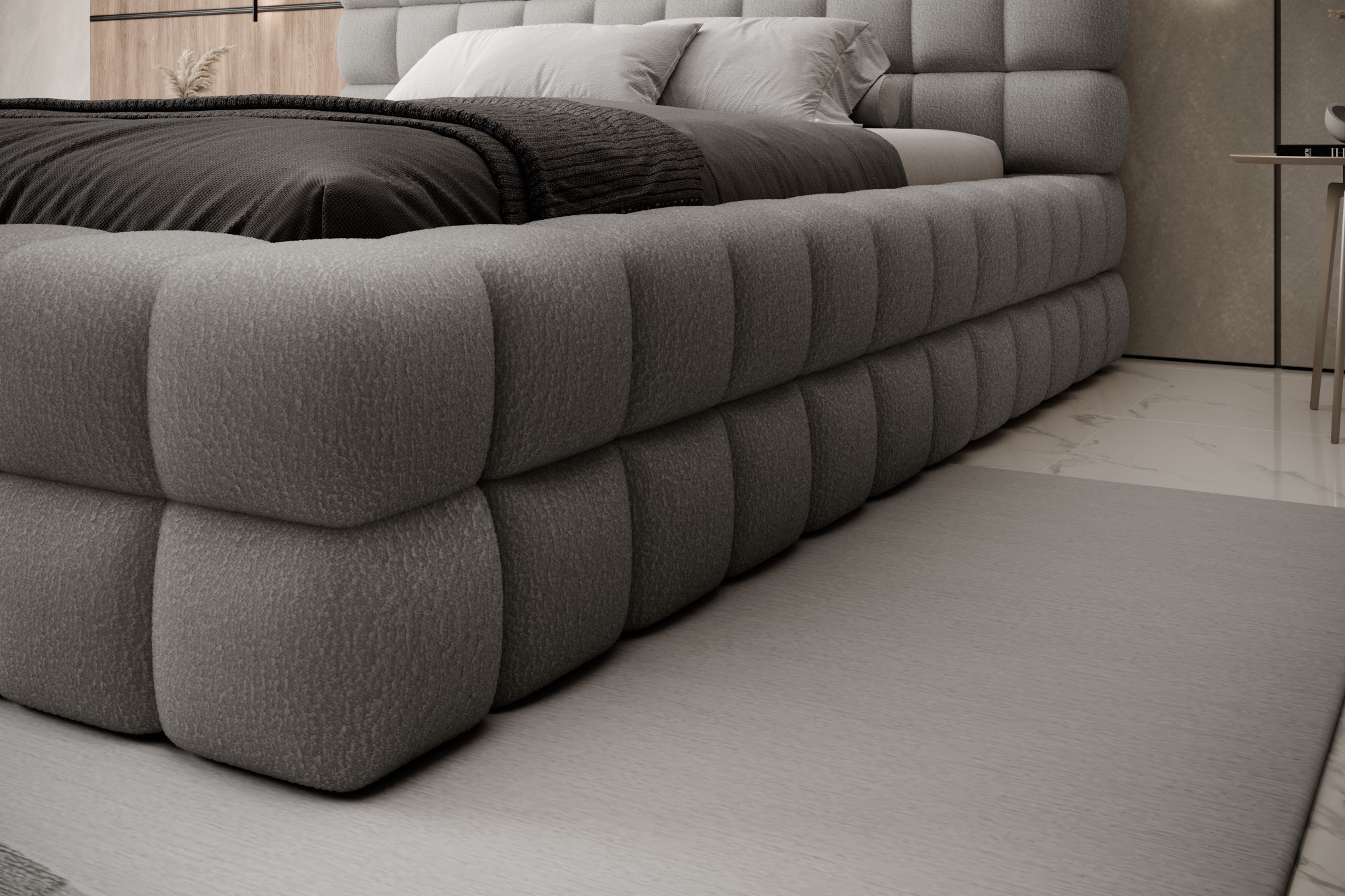 Posteľ Dizzle vo verzii s impozantnou šírkou 180 cm je ideálnym riešením pre tých, ktorí túžia po ešte väčšom priestore na spánok, bez toho aby obetovali eleganciu a pohodlie. Využíva penu T2130, ktorá poskytuje pružnosť a jedinečný spánkový komfort. So tromi rôznymi možnosťami šírky je 180 cm návrhom pre nadšencov priestrannosti. Dĺžka postele je 225 cm a jej impozantná výška 104 cm dodáva celej konštrukcii eleganciu.Výška sedadla je 42 cm; odporúča sa však pridať výšku matraca pre plný komfort pri používaní. Čierne plastové nohy s výškou 2 cm zabezpečujú stabilitu. Kovový rám zaručuje odolnosť konštrukcie a jedna úložná priehradka robí posteľ Dizzle 180 praktickým miestom na uloženie ďalších vecí.S 36 lamelami pre rovnomernú podporu matraca prináša posteľ Dizzle, ktorej tvar pripomína elegantnú kocku, do vašej spálne nielen priestrannosť, ale aj štýlový dizajn a pohodlnú relaxáciu.