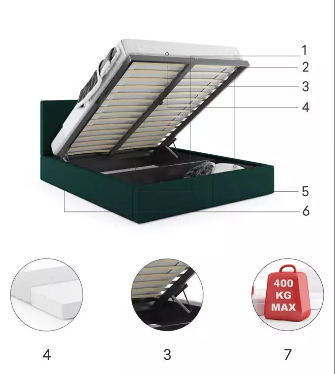 - Vyrobené z kvalitnej laminovanej dosky, ktorá sa vyznačuje odolnosťou a jednoduchým čistením. Horná časť a rám - čalúnené. Čalúnnický materiál - jeho charakteristickou črtou je jemná štruktúra a povrch pokrytý jemným mesquitom, odolný voči oderu, zmršteniu a svetlu. Materiál má vlastnosť obmedzenej absorpcie kvapalín, čo má pozitívny vplyv na udržiavanie čistoty.